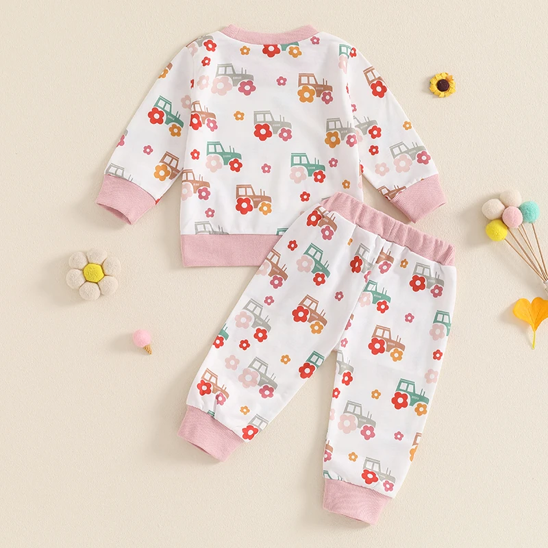 Conjuntos de otoño para niñas pequeñas, pantalones de manga larga con cuello redondo y estampado floral de tractor