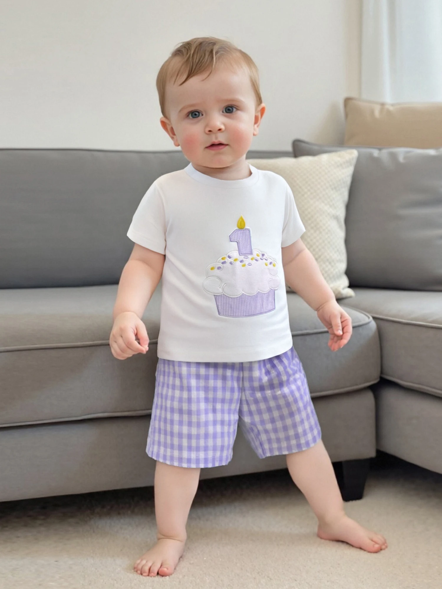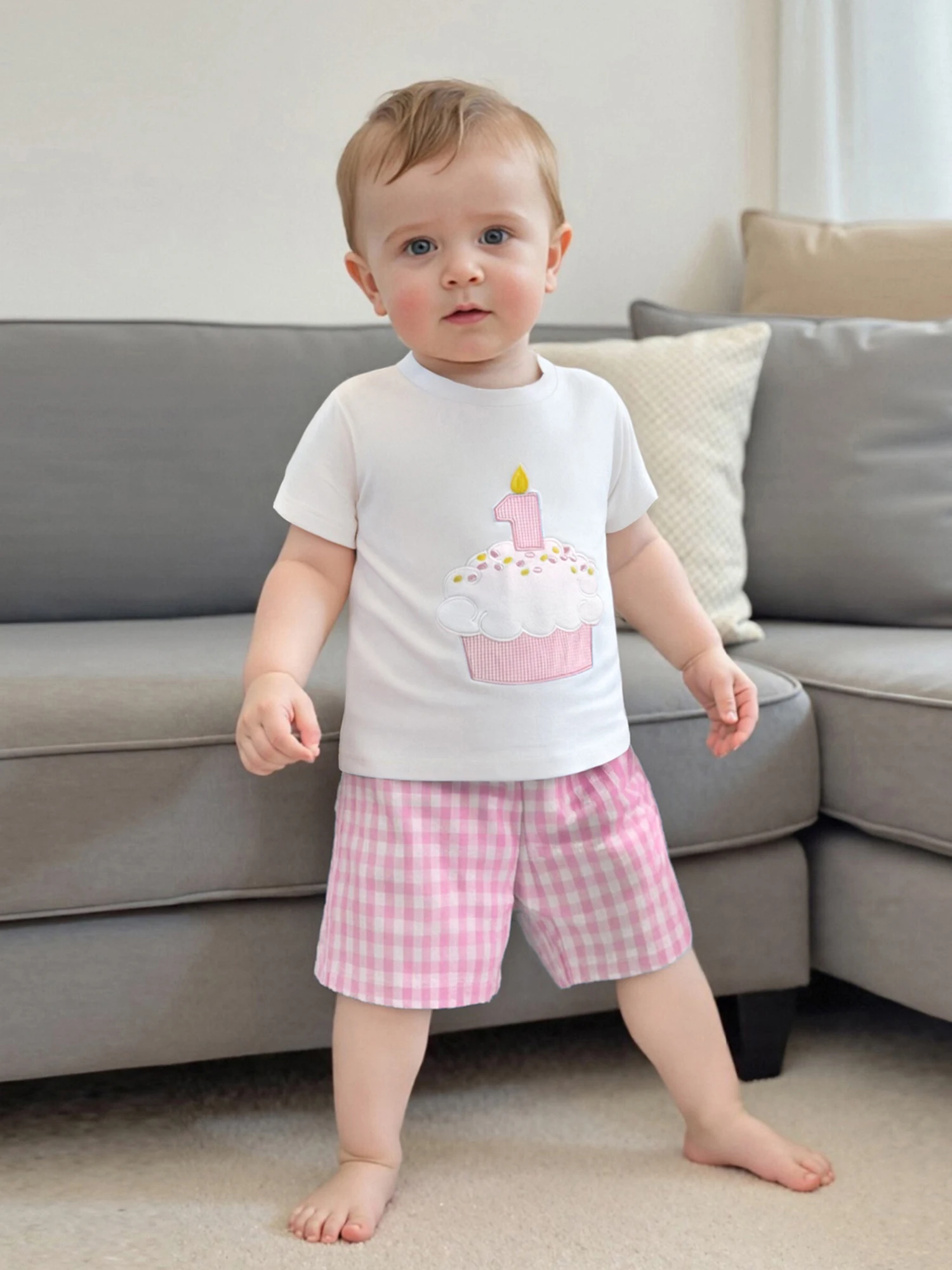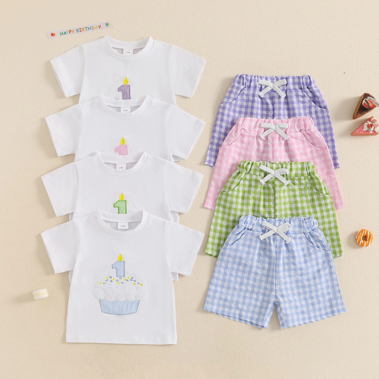 Conjunto de pantalones cortos para bebé, camiseta de manga corta con cuello redondo y bordado con números de cupcakes y pantalones cortos a cuadros, traje de cumpleaños de un año