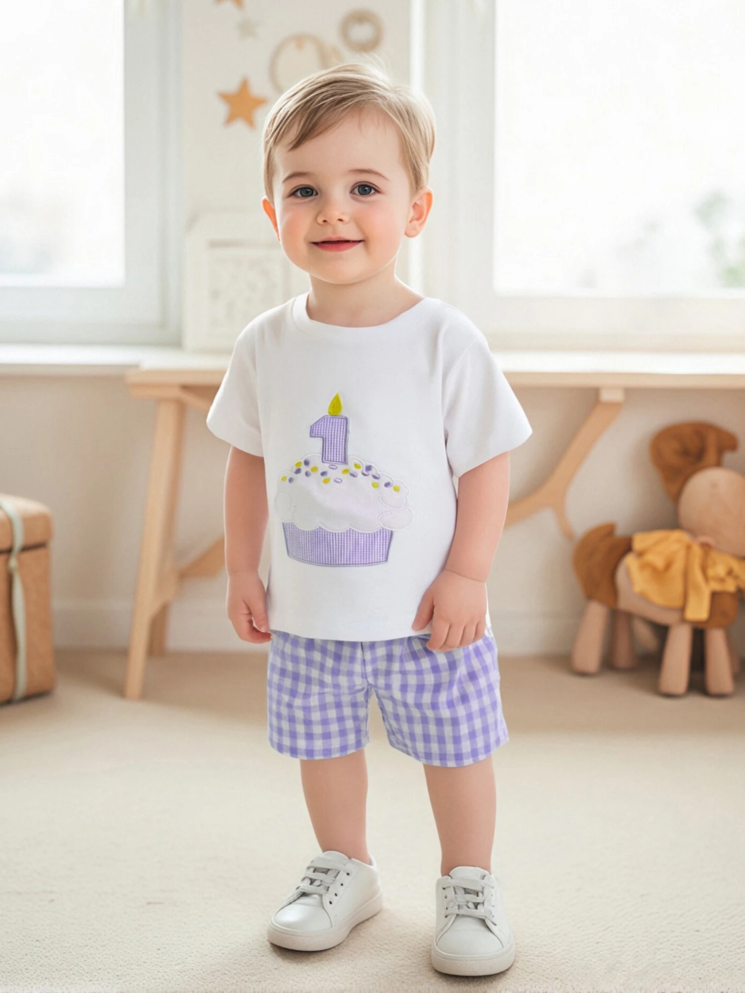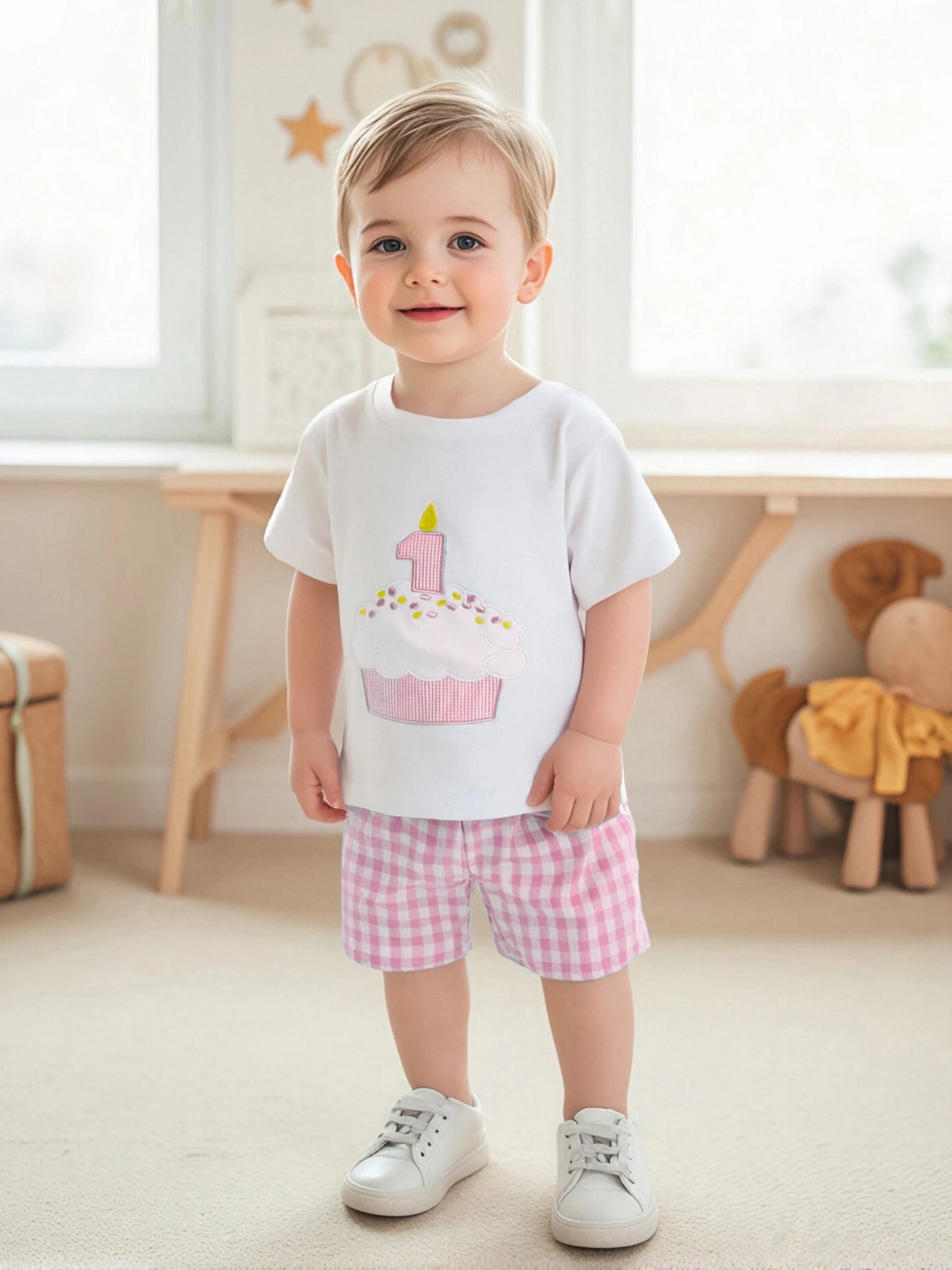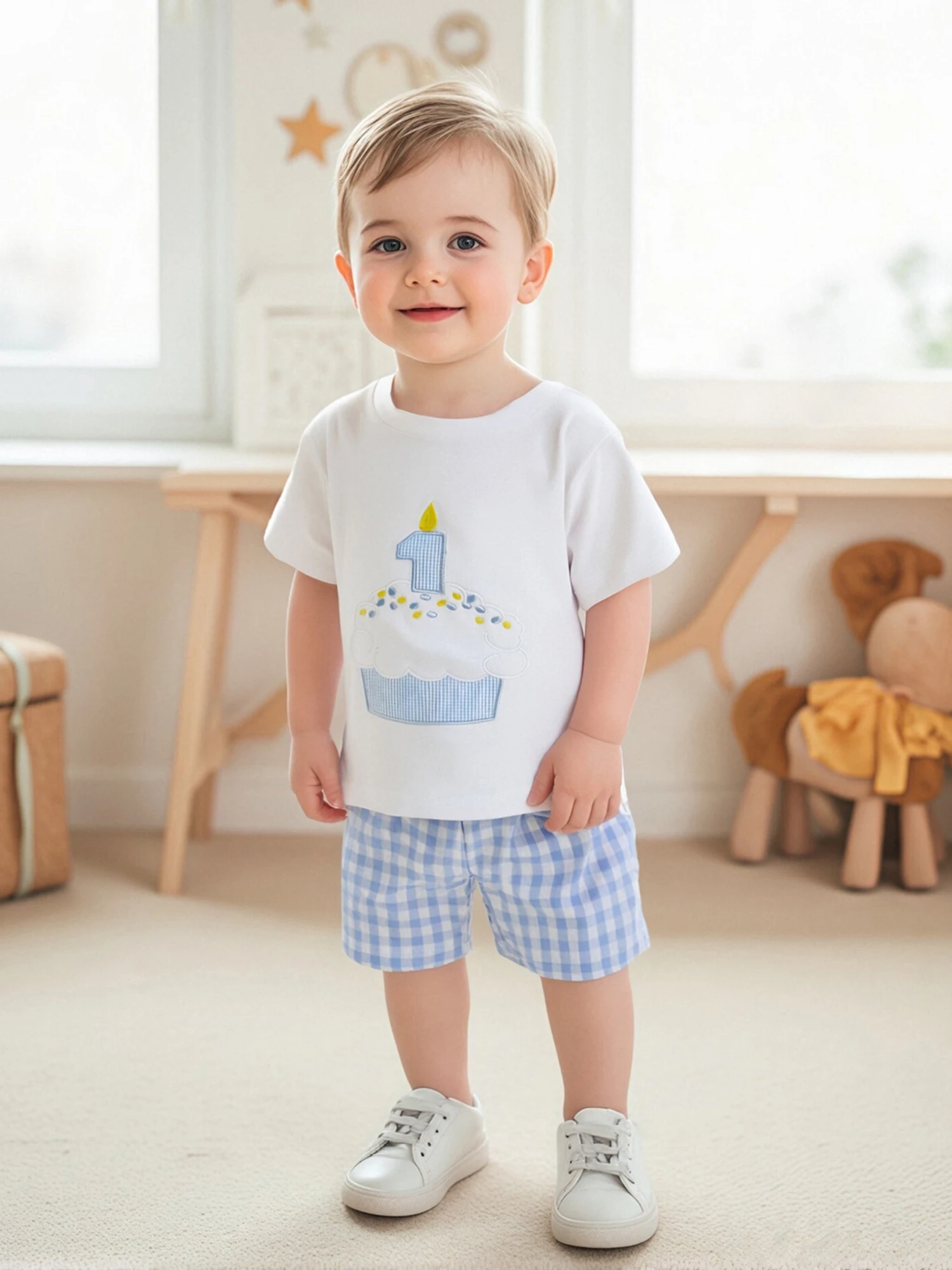 Conjunto de pantalones cortos para bebé, camiseta de manga corta con cuello redondo y bordado con números de cupcakes y pantalones cortos a cuadros, traje de cumpleaños de un año
