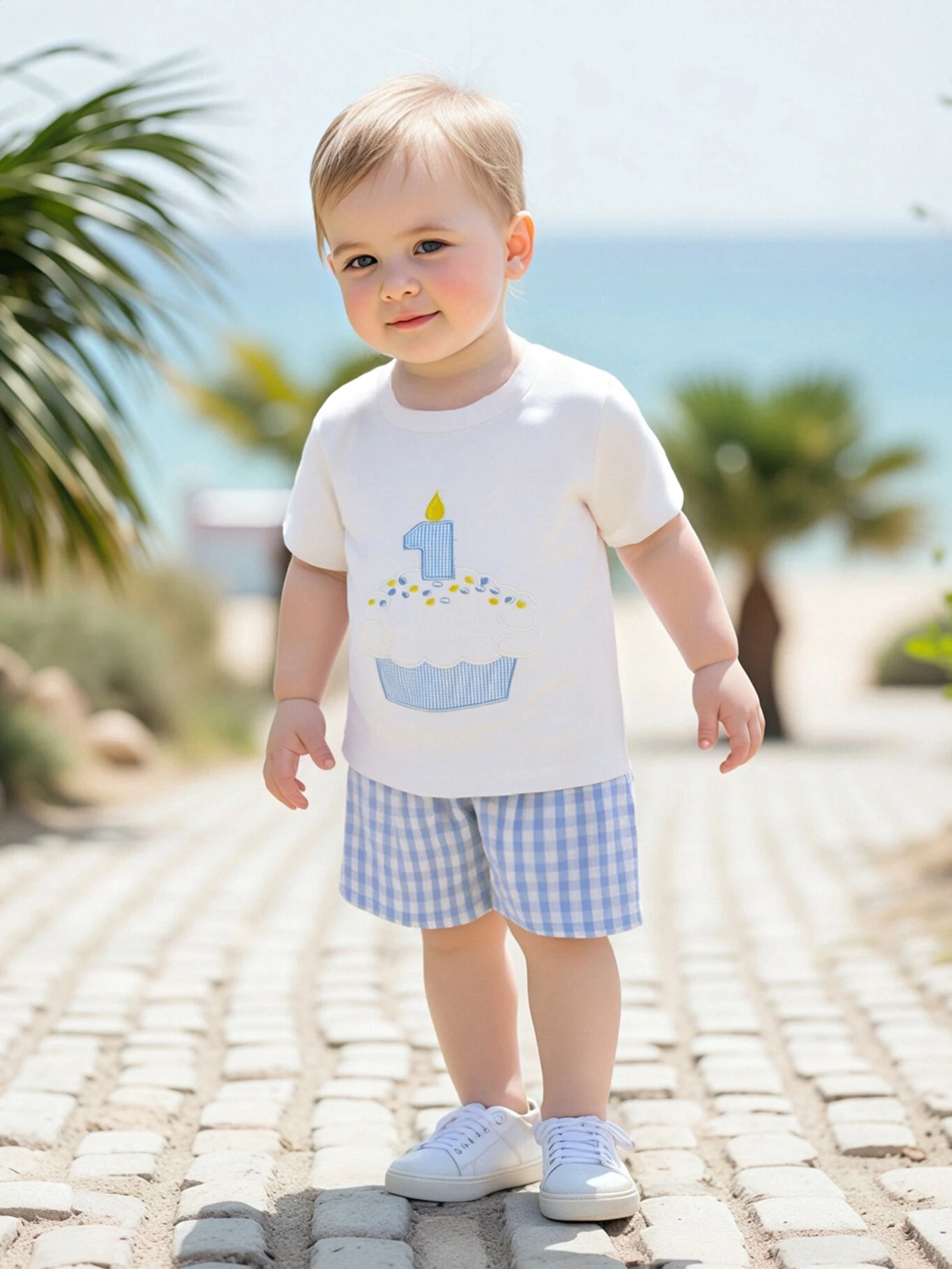 Comprar Suefunskry Conjunto de pantalones cortos para bebé, camiseta de manga corta con cuello redondo y números de magdalenas bordados con pantalones cortos a cuadros, traje de cumpleaños de un año