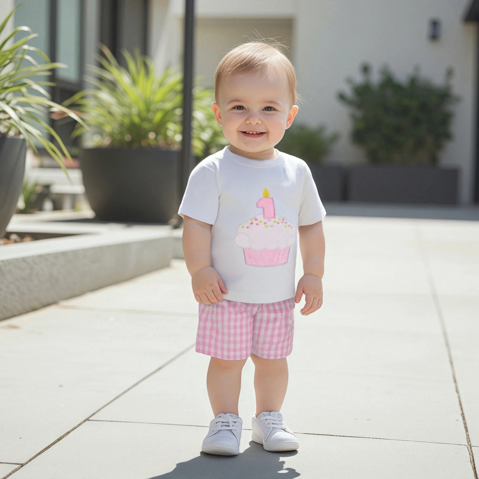 Conjunto de pantalones cortos para bebé, camiseta de manga corta con cuello redondo y bordado con números de cupcakes y pantalones cortos a cuadros, traje de cumpleaños de un año