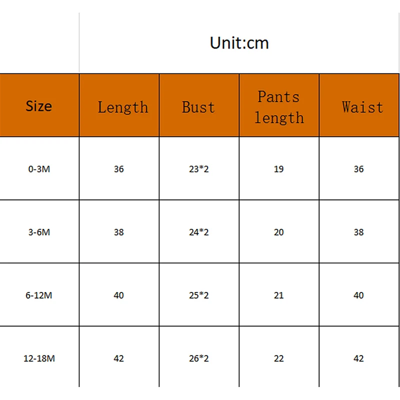Busto 0-3 M: 46 Cintura: 36 Longitud del mameluco: 36 Longitud de los pantalones cortos: 19 Edad sugerida: 0-3 meses