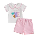Conjunto de pantalones cortos para niñas, camiseta bordada con cuello de muñeca de manga corta y pantalones cortos a cuadros, traje de verano de 2 piezas