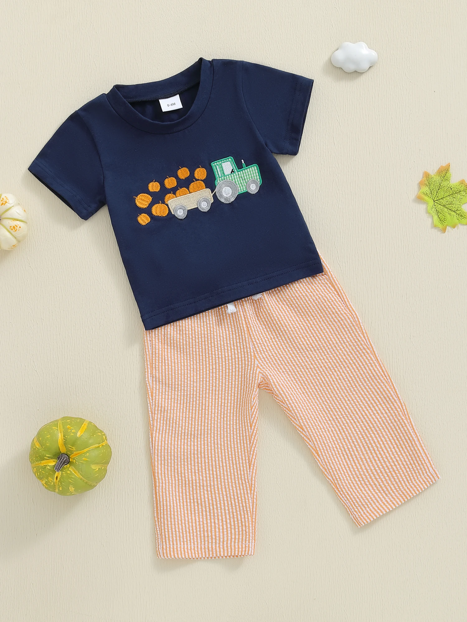 Conjunto de 2 piezas de camiseta con estampado de calabaza y camión de manga corta para Halloween, conjunto de pantalones a rayas