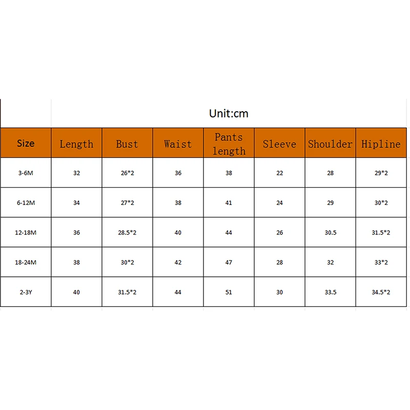 70 Longitud de la camiseta: 12,6 Busto: 20.47 Manga: 8,66 Hombro: 11,02 Longitud de los pantalones: 14,96 Cintura: 14,17 Cadera: 22,83 Edad recomendada: 3-6 meses