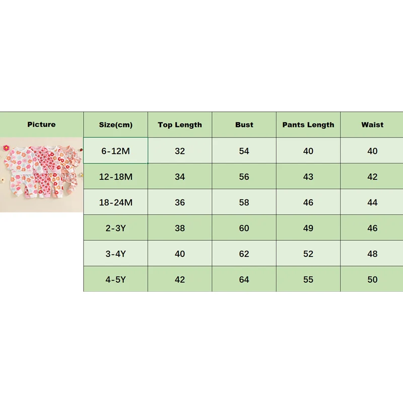 4-5Y Tops Longitud: 16,54 Busto: 25,2 Longitud de los pantalones: 21,65 Cintura: 19,68 Edad recomendada: 4-5 años
