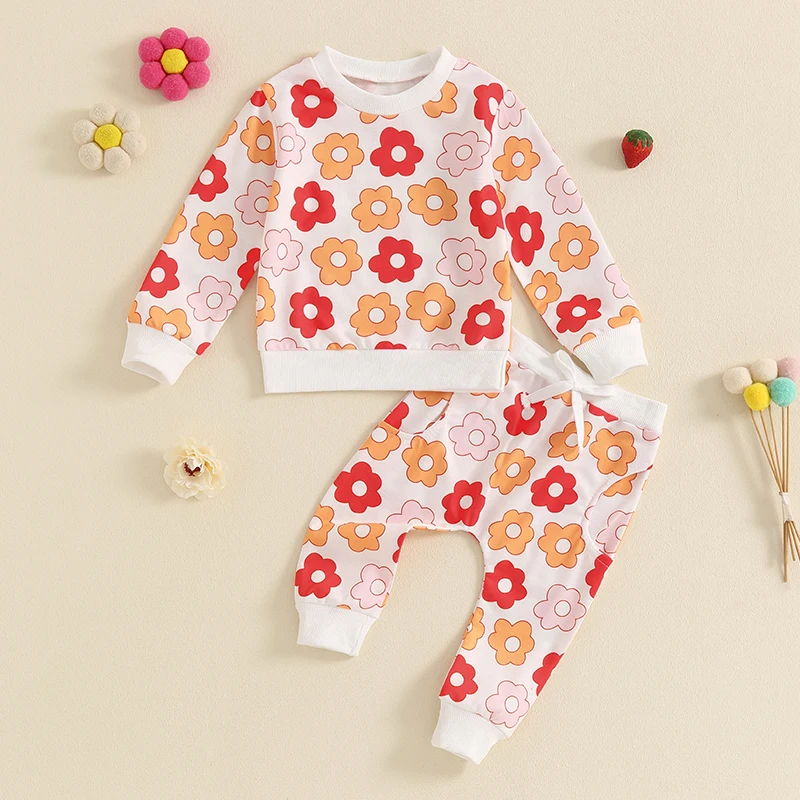 Conjuntos de otoño para niña pequeña, sudaderas de manga larga con cuello redondo y pantalones largos con estampado floral, conjunto de ropa de 2 piezas