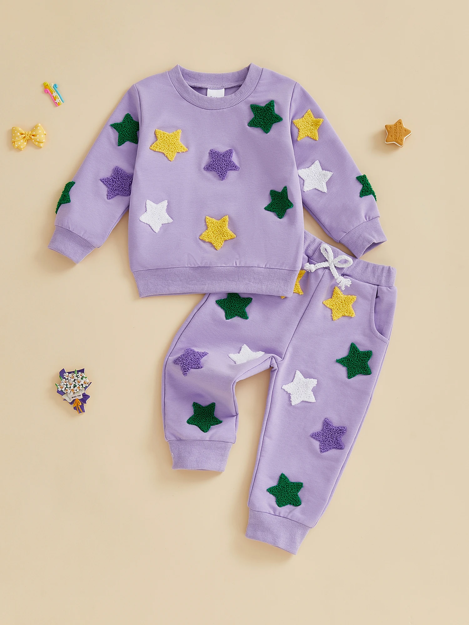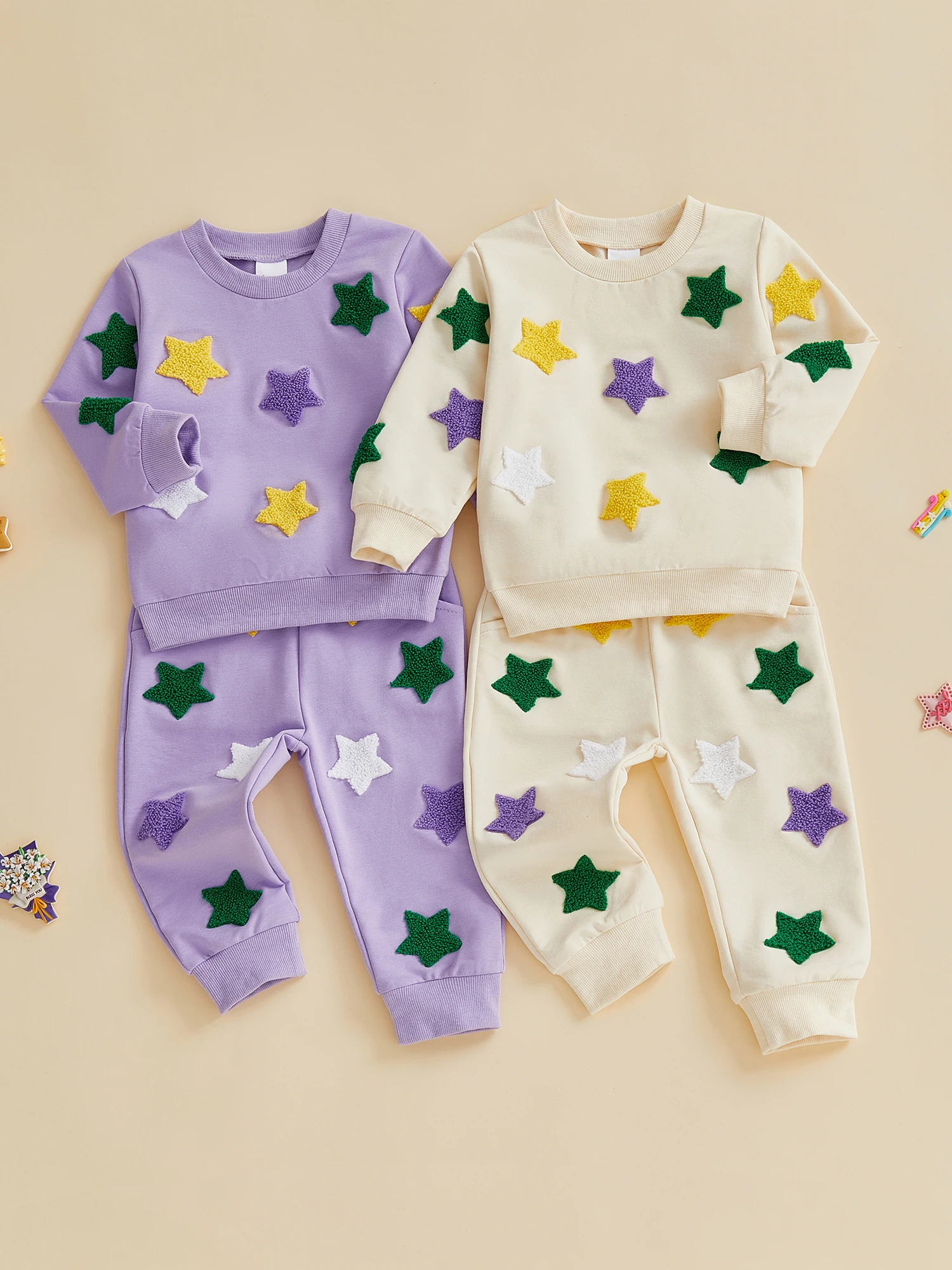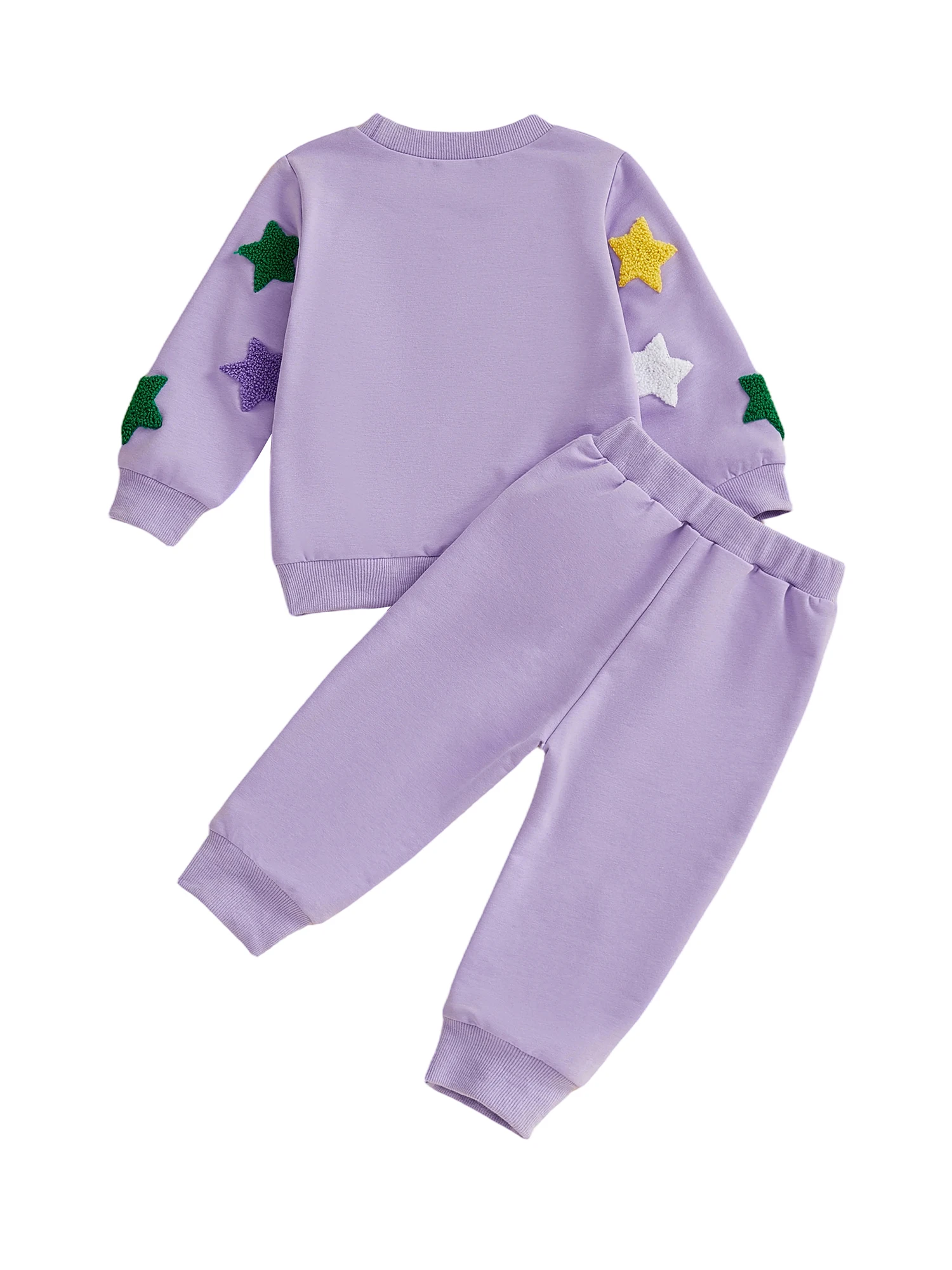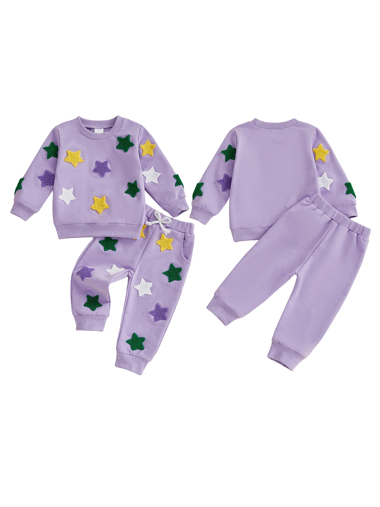 Conjunto de sudadera y pantalones de cintura elástica con bordado de estrellas coloridas y cuello redondo de manga larga para niña y niño