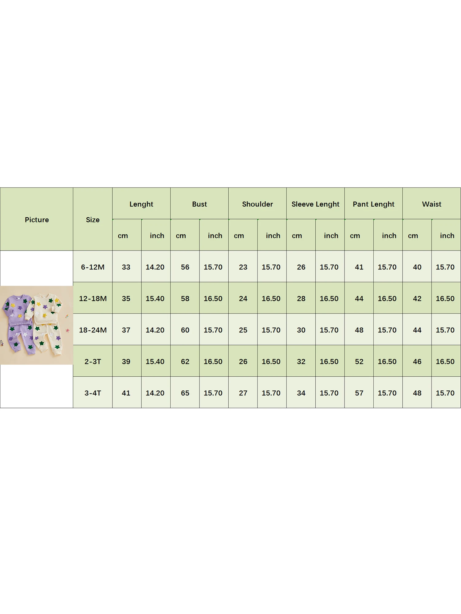 6-12M Longitud de la parte superior: 14,20 Busto: 15,70 Hombro: 15,70 Longitud de la manga: 15,70 Longitud del pantalón: 15,70 Cintura: 15,70 Cadera: 15,70 Edad recomendada: 6-12 meses