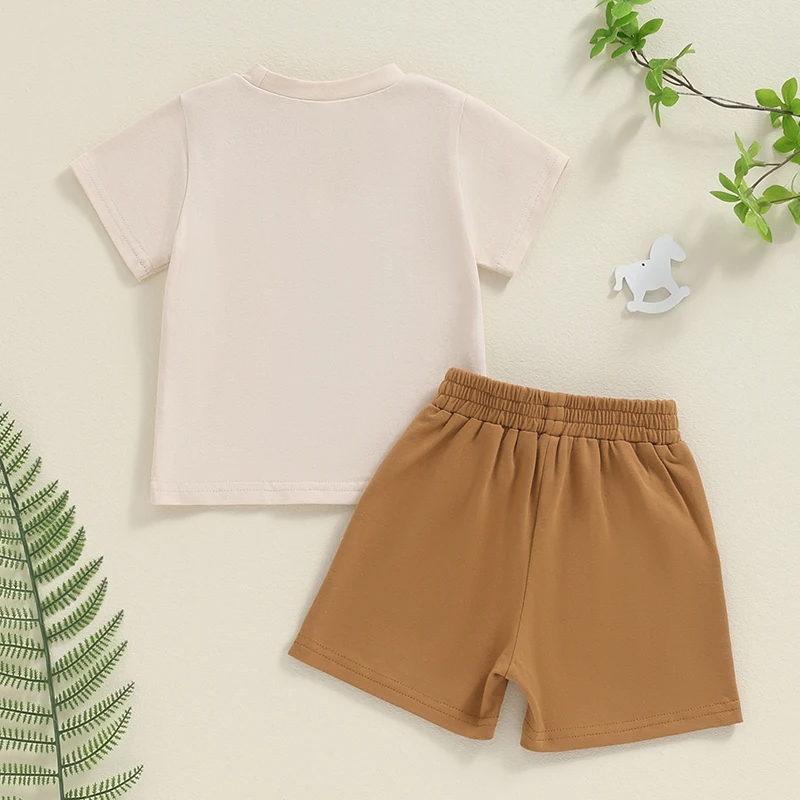 Traje de verano para niño pequeño Estampado de letras de animales Mangas cortas Cuello redondo Tops con pantalones cortos de color sólido
