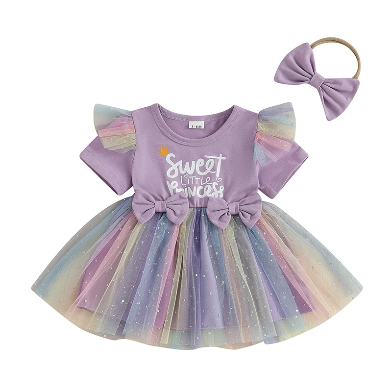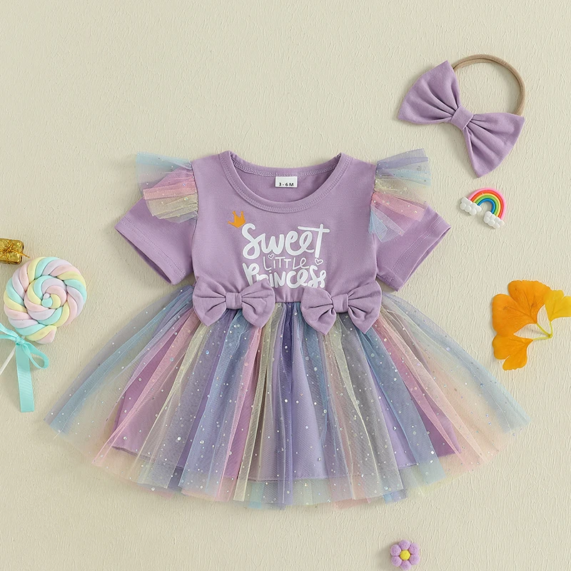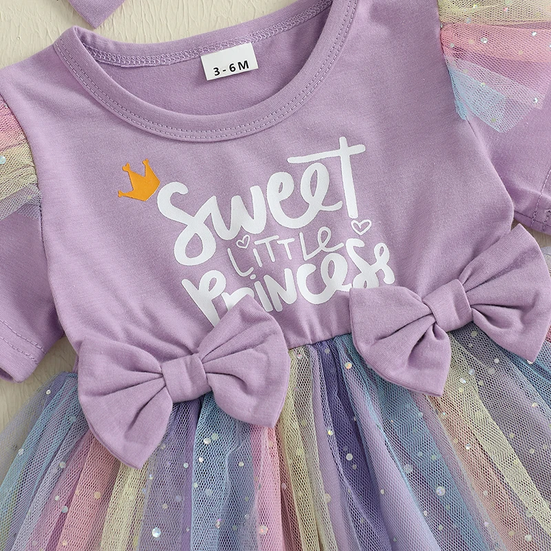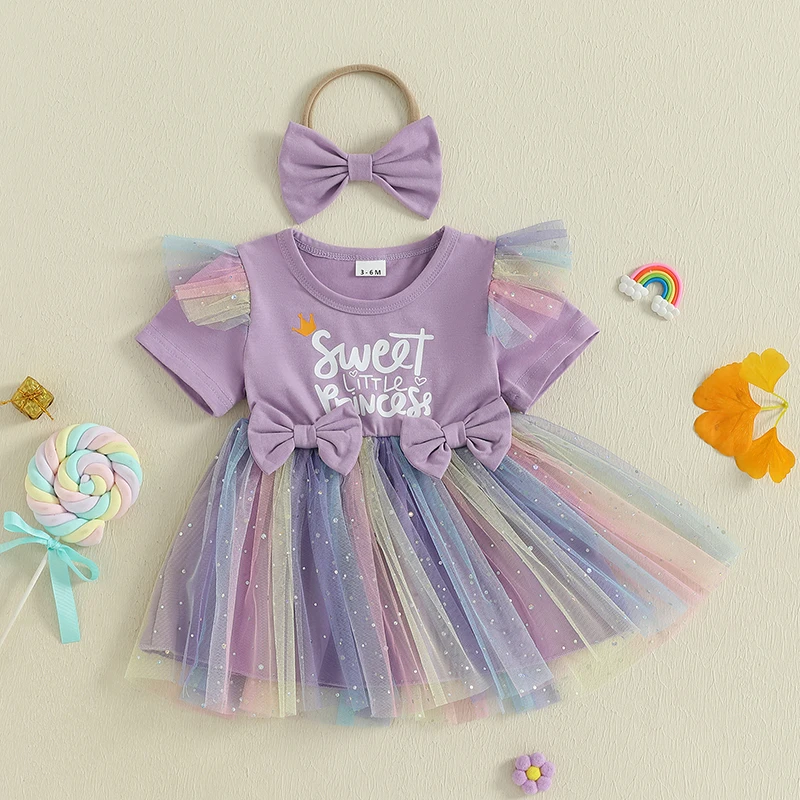 Conjunto de vestido para niña, manga corta, cuello redondo, estampado de letras, vestido de retales de tul con diadema con lazo, traje de verano