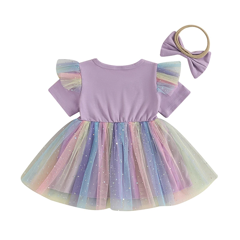 Comprar Suefunskry Conjunto de vestido para niña, vestido de retazos de tul con estampado de letras y cuello redondo de manga corta con diadema con lazo, traje de verano