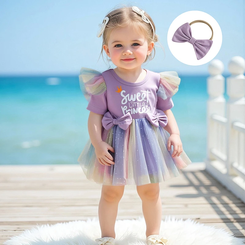 Conjunto de vestido para niña, manga corta, cuello redondo, estampado de letras, vestido de retales de tul con diadema con lazo, traje de verano