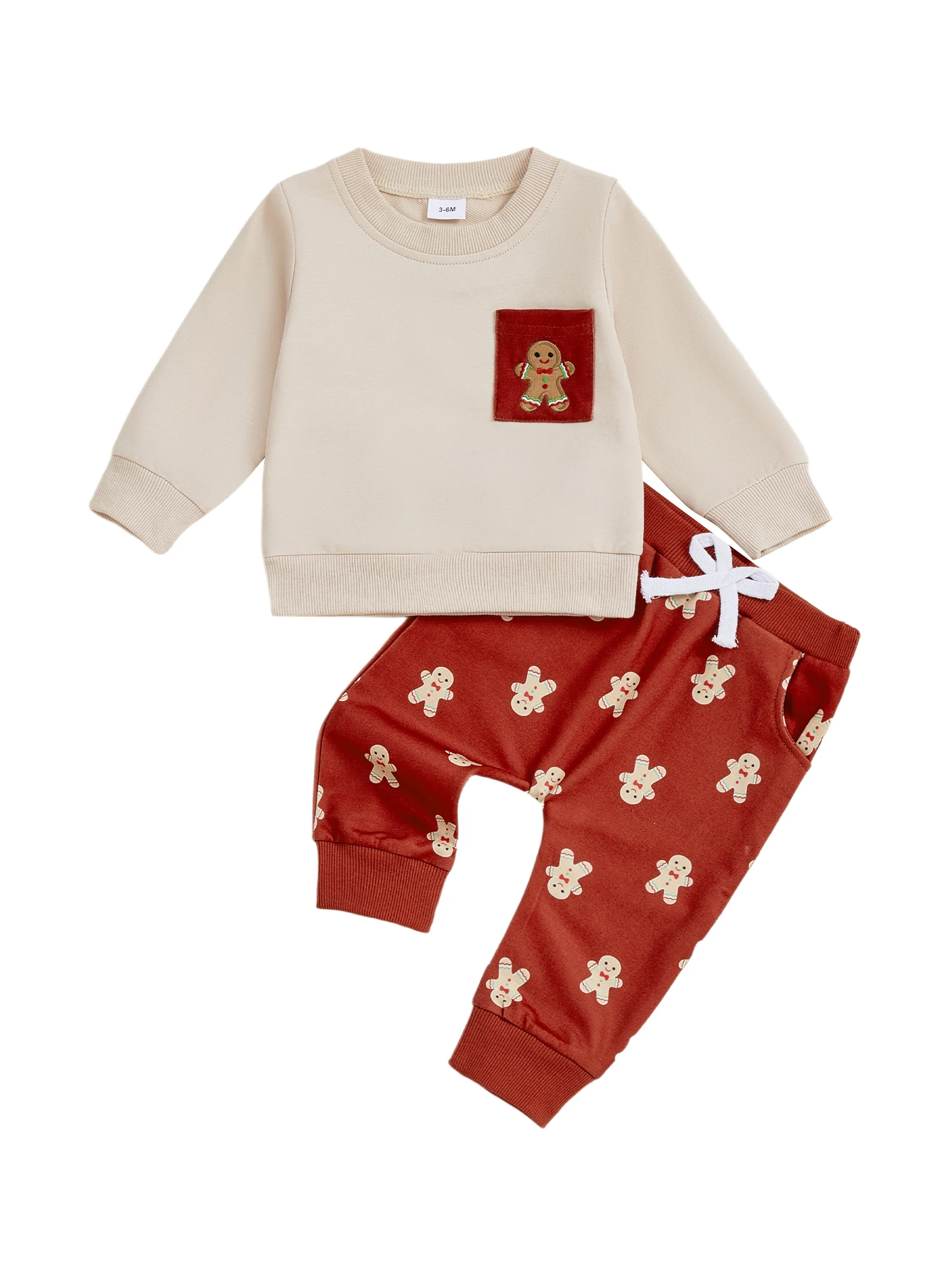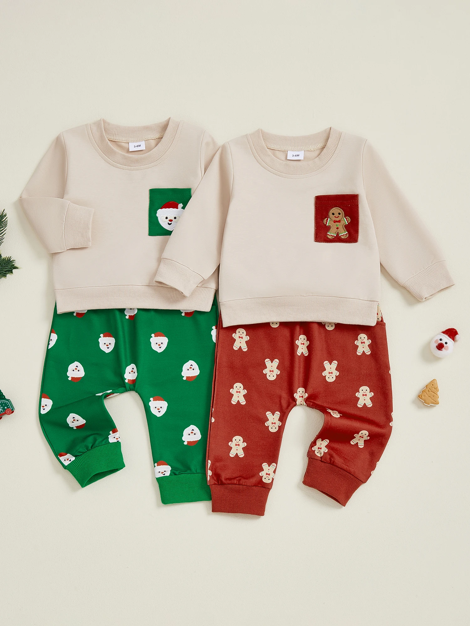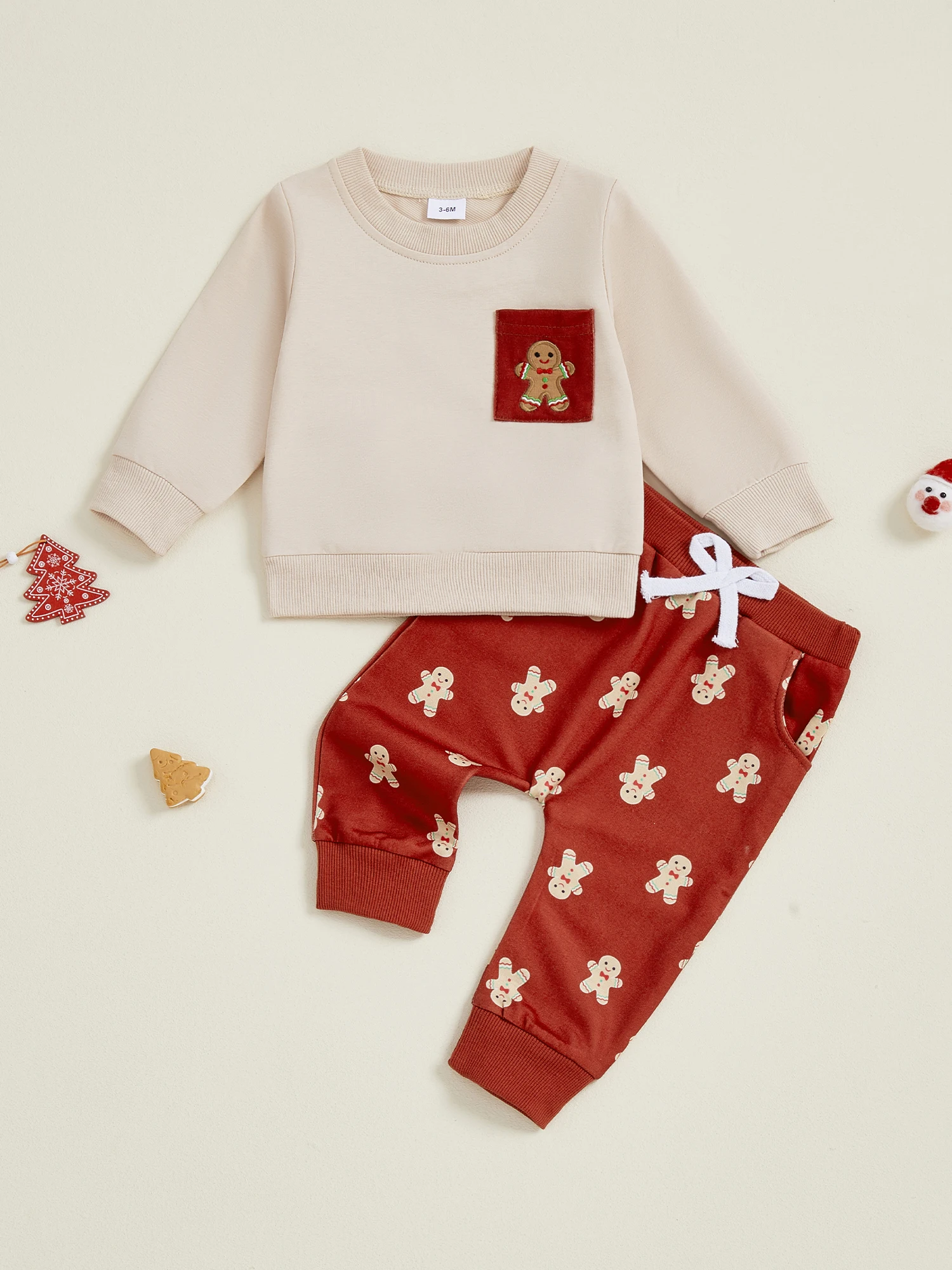 Conjuntos de pantalones navideños de 2 piezas para niños, camisetas de manga larga con cuello redondo, pantalones con cordón y estampado de pan de jengibre