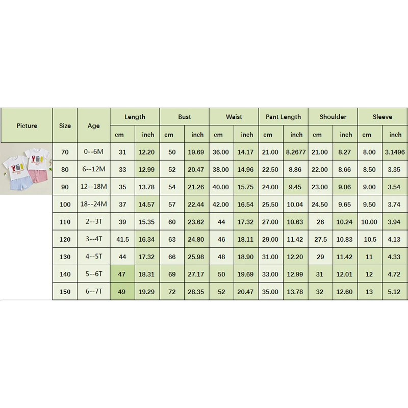 80 Longitud de la camiseta: 12,99 Busto: 20,47 Manga: 3,35 Hombro: 8,66 Longitud de los pantalones: 8,86 Cintura: 14,96 Edad recomendada: 6-12 meses
