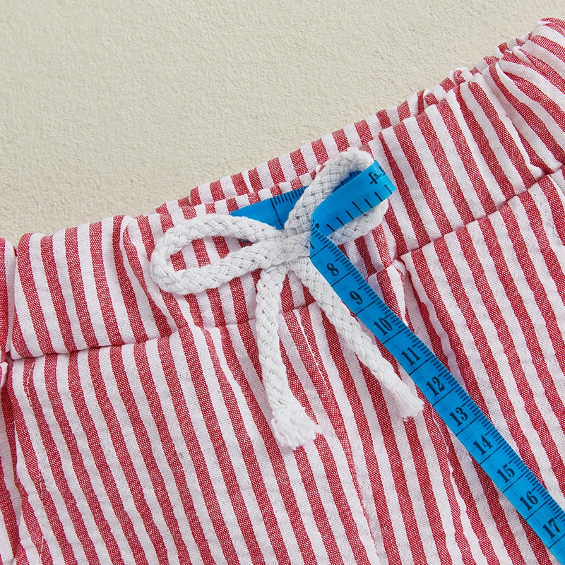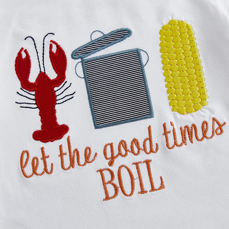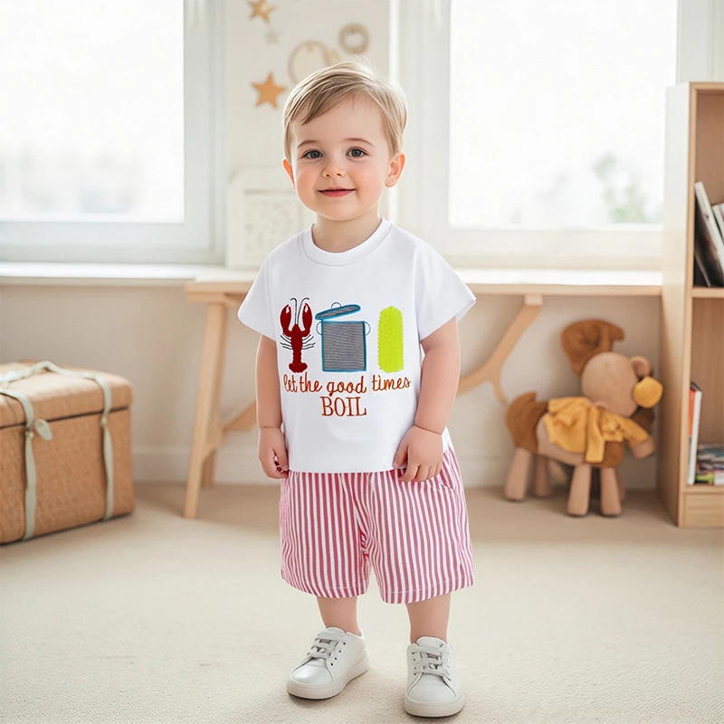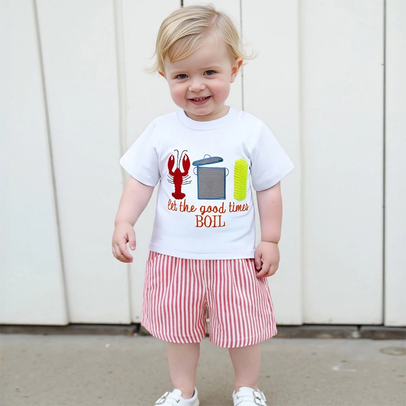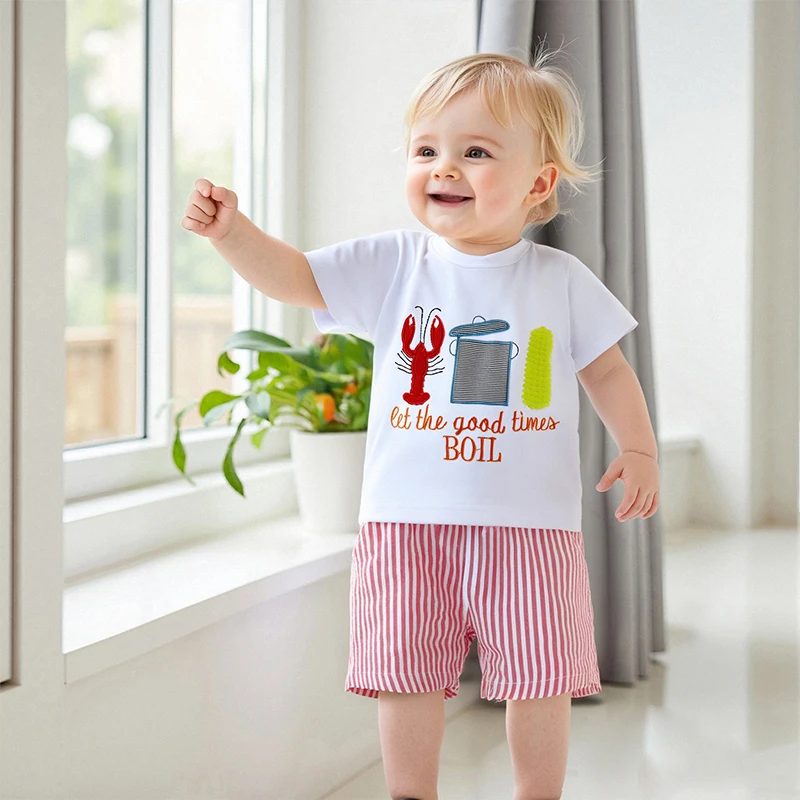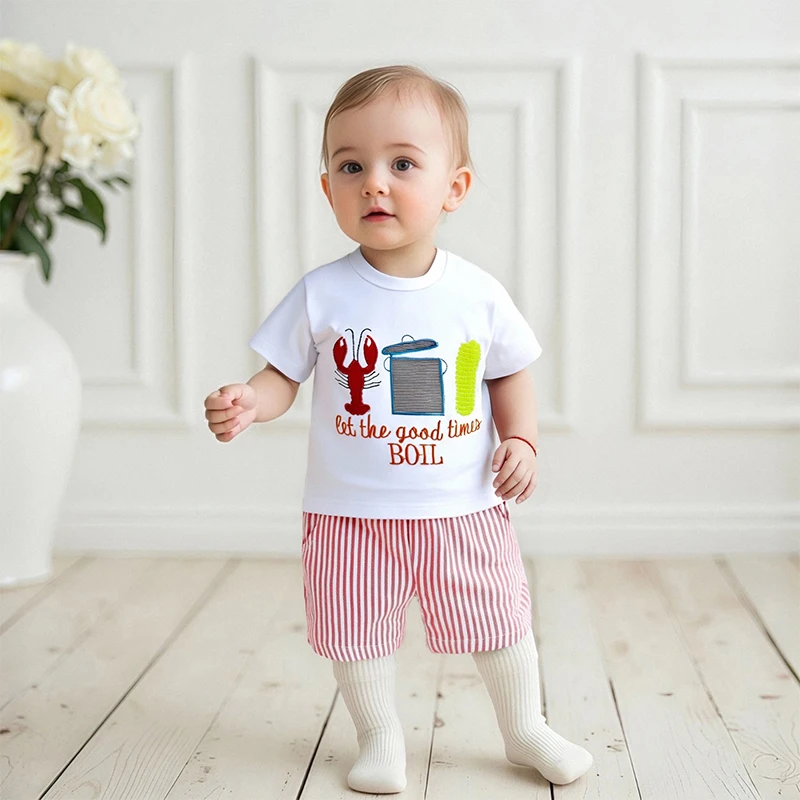 Conjuntos de pantalones cortos de verano para niños, camisetas con estampado de maíz de langosta y cuello redondo de manga corta y pantalones cortos a rayas