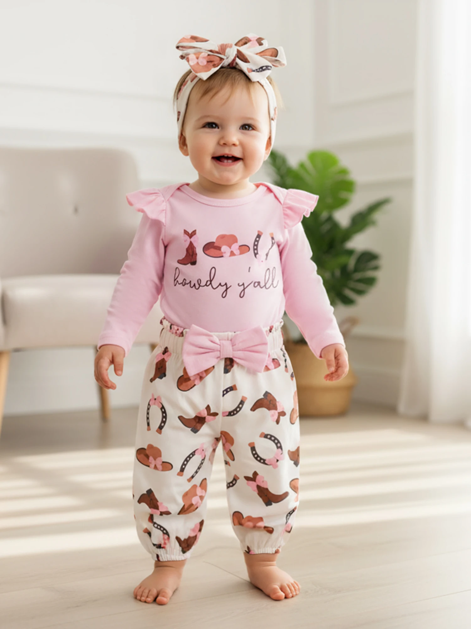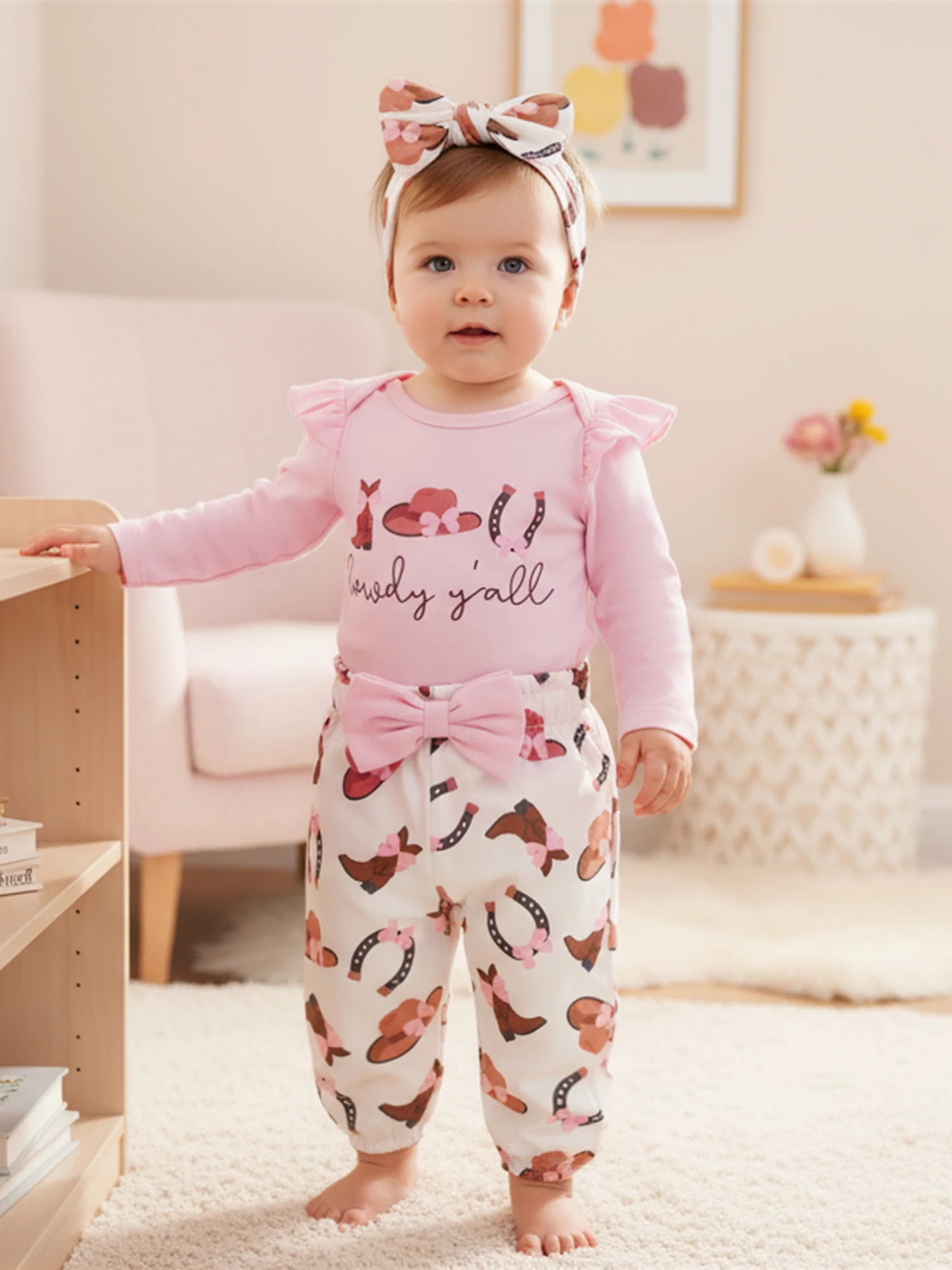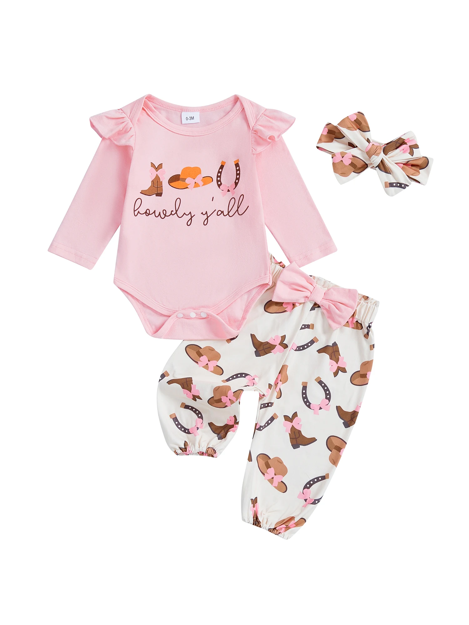 Conjuntos de ropa para niña, botas occidentales de moda, mameluco de manga larga estampado con pantalones, diadema, 3 uds., trajes de otoño