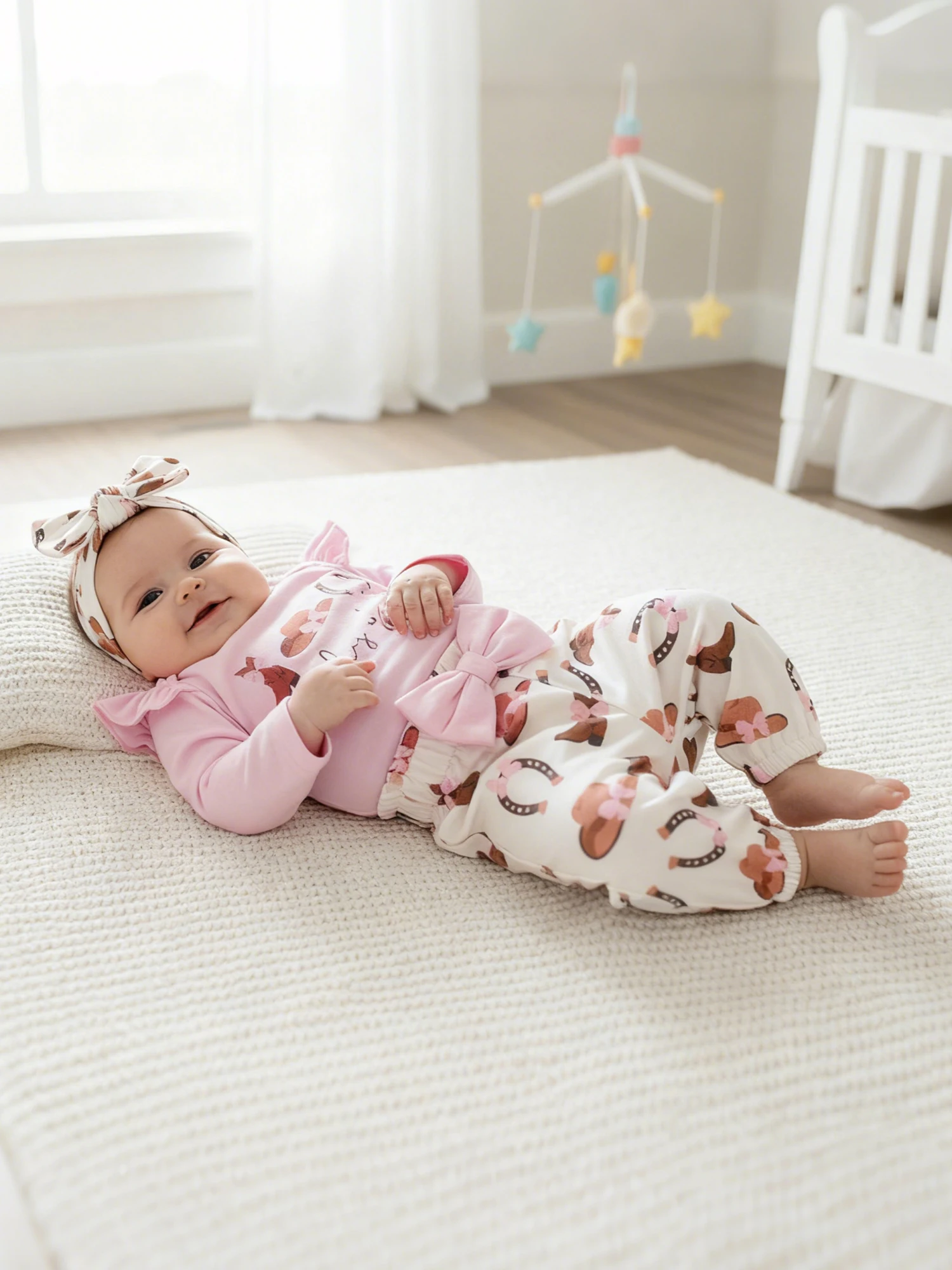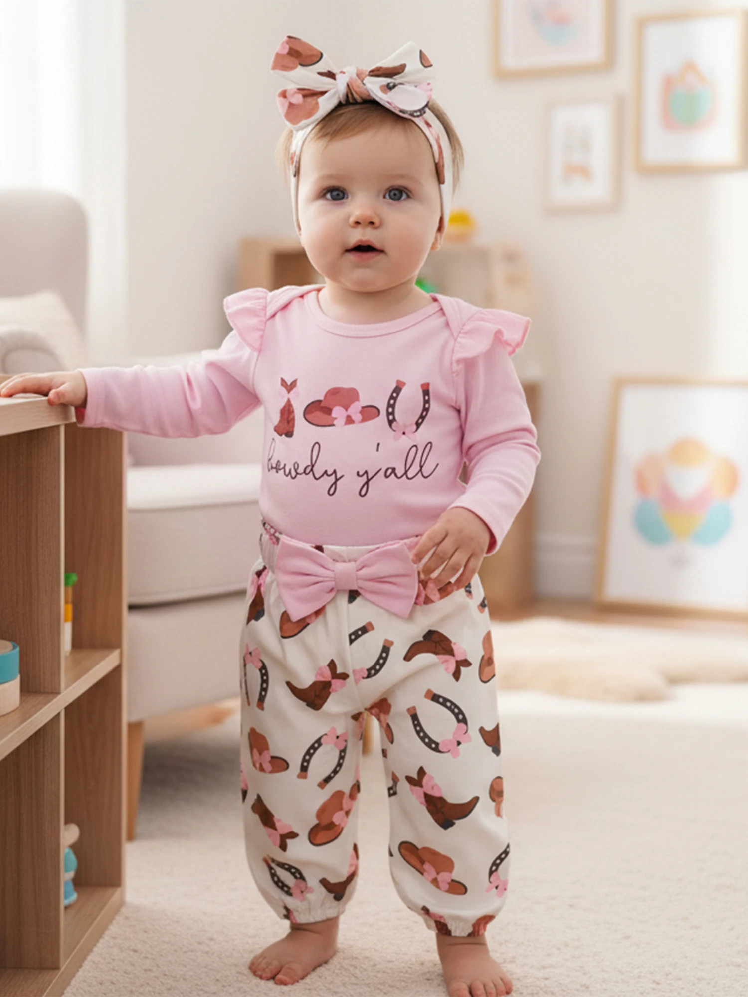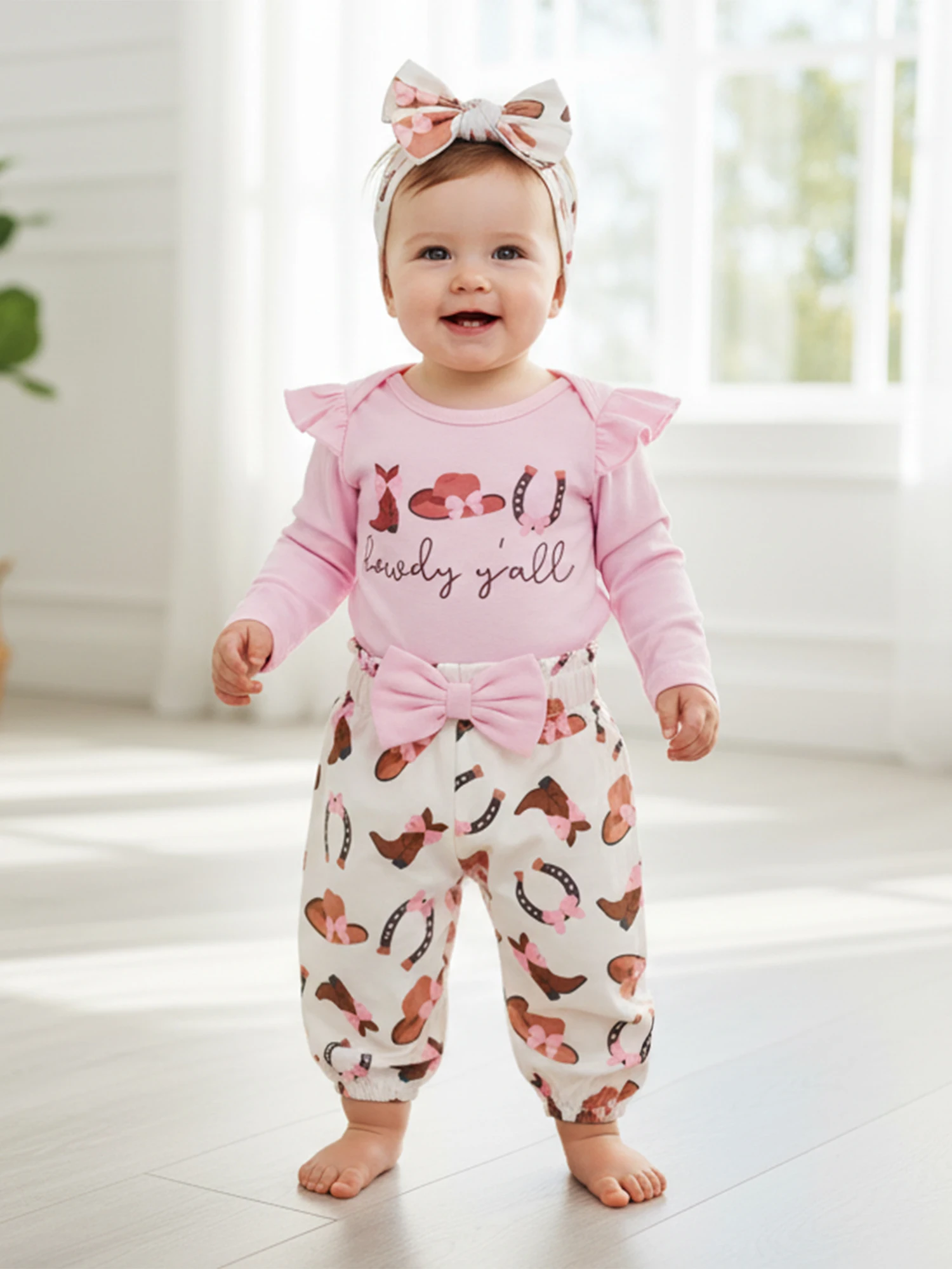 Conjuntos de ropa para niña, botas occidentales de moda, mameluco de manga larga estampado con pantalones, diadema, 3 uds., trajes de otoño