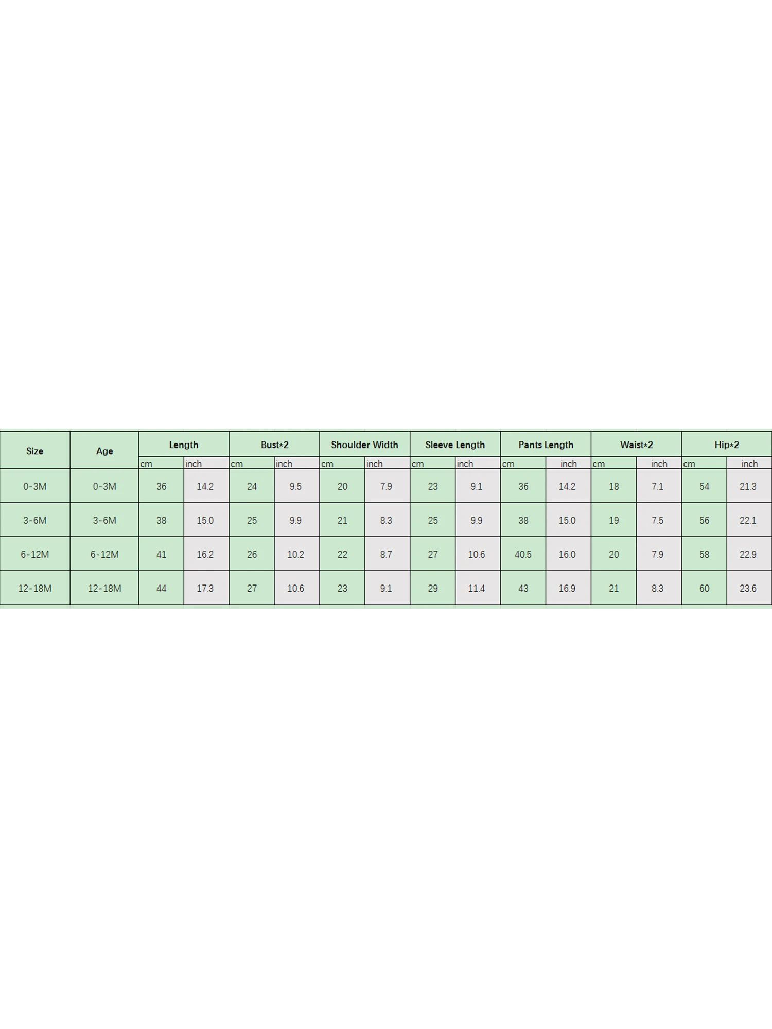 3-6M Longitud de la camiseta: 14,96 Busto: 19,69 Manga: 9,84 Hombro: 8,27 Longitud de los pantalones: 14,96 Cintura: 14,96 Cadera: 22,05 Edad recomendada: 3-6 meses