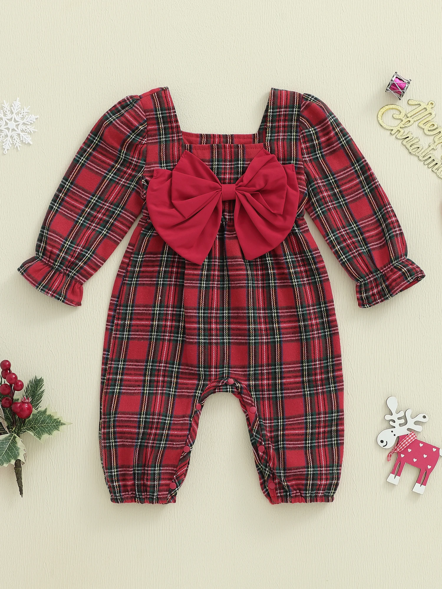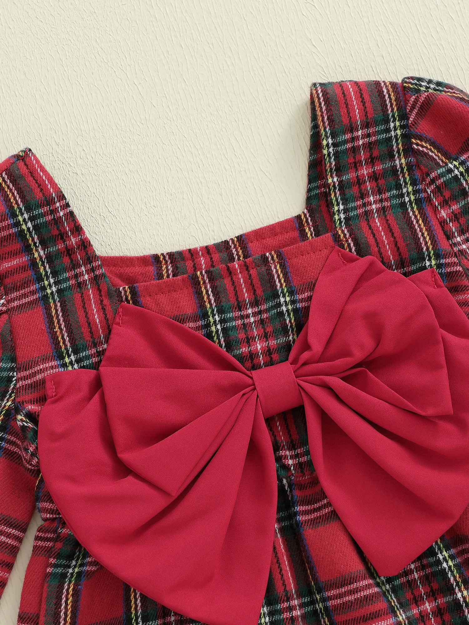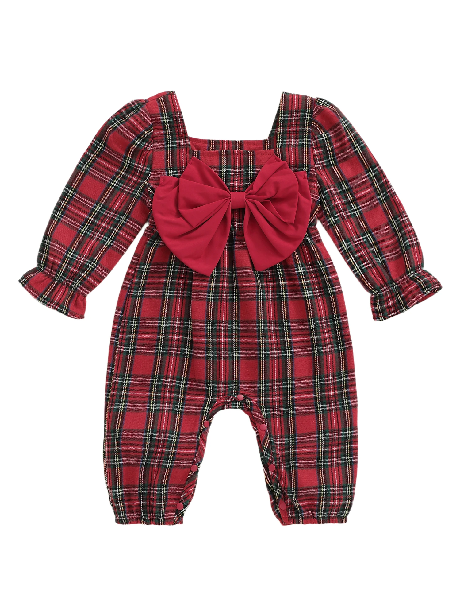 Mameluco a cuadros de Navidad para niña, mono con lazo grande de manga larga y cuello cuadrado, diadema