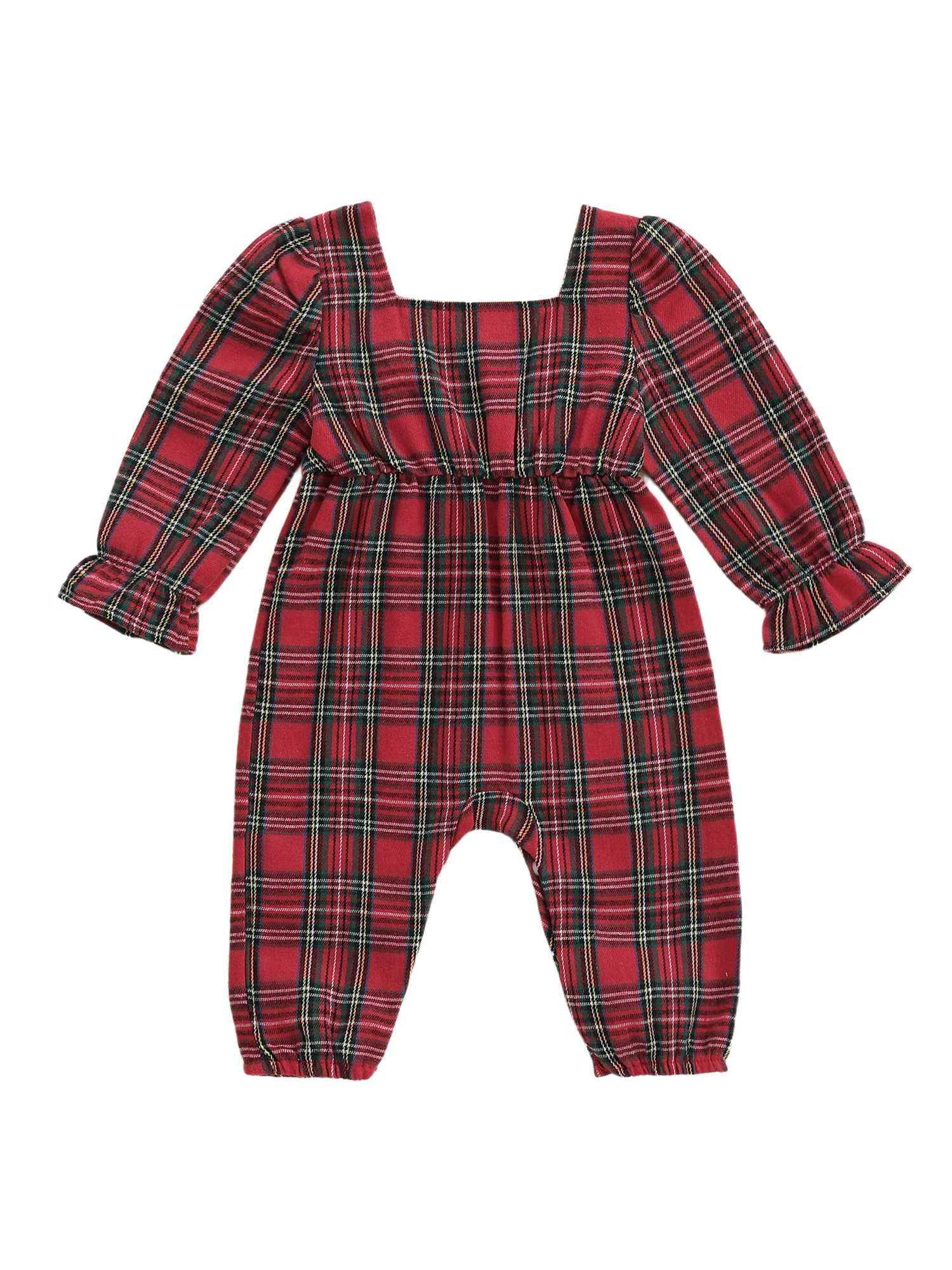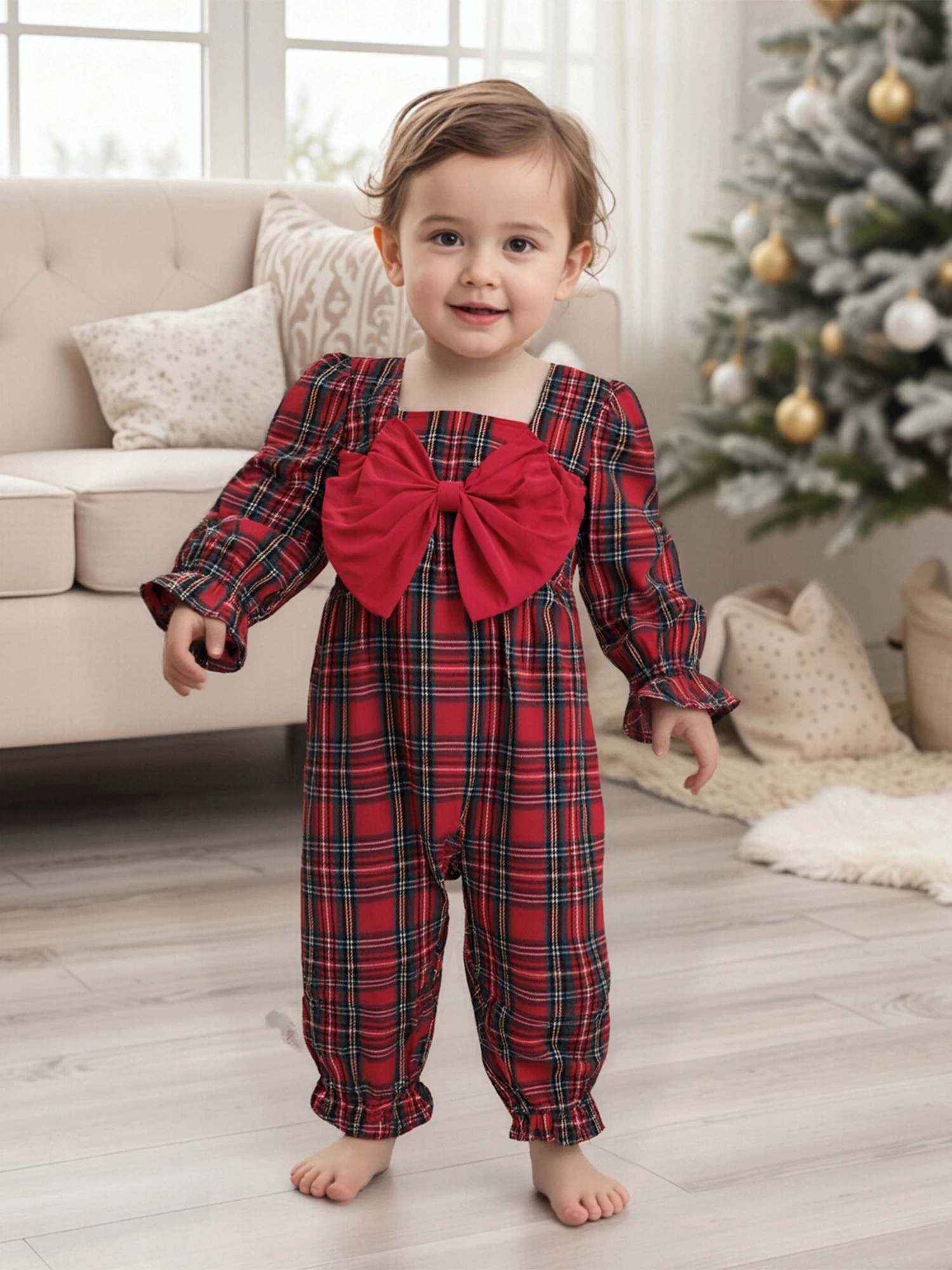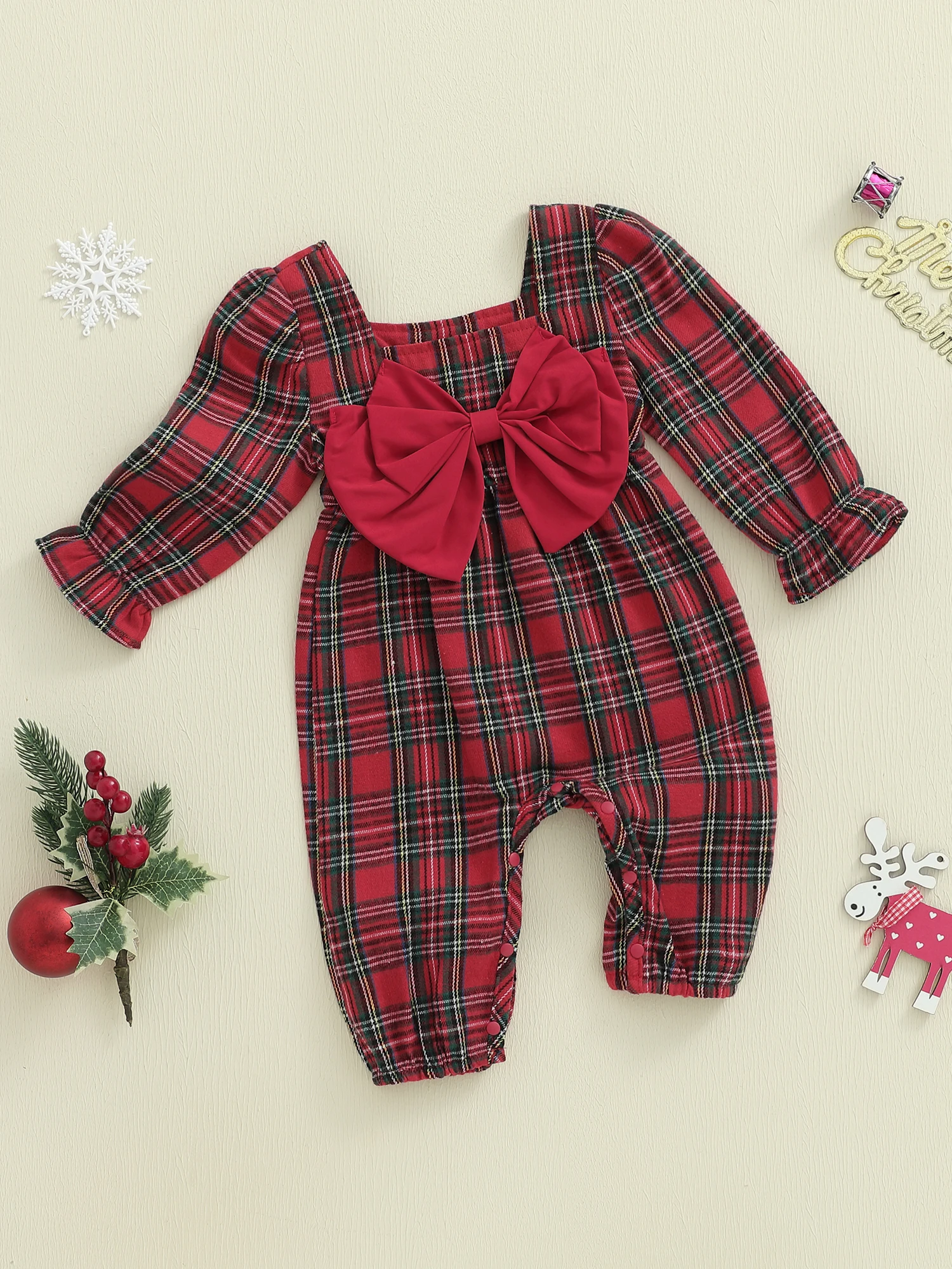 Mameluco a cuadros de Navidad para niña, mono con lazo grande de manga larga y cuello cuadrado, diadema