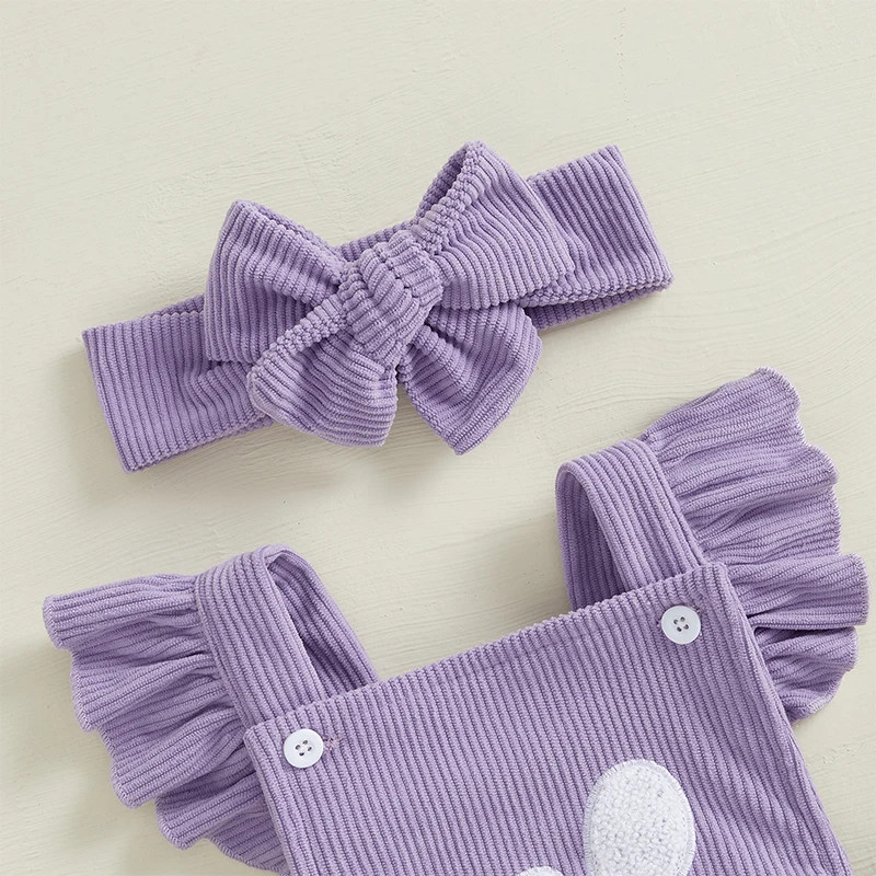 Mameluco casual de Pascua para niña Mameluco bordado de conejito de manga voladora con diadema