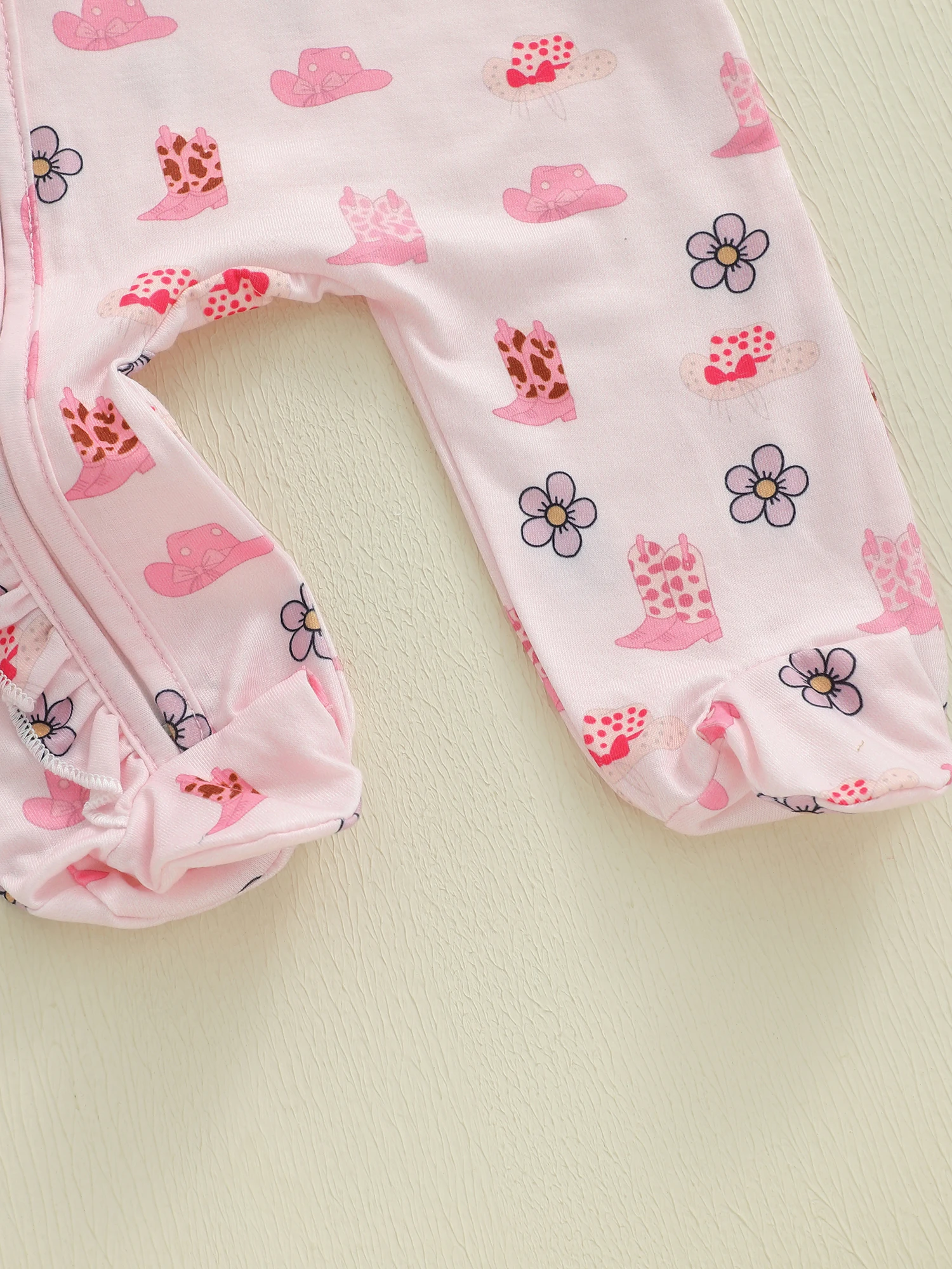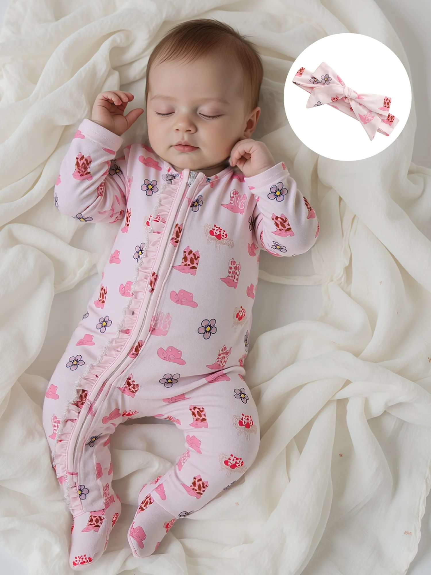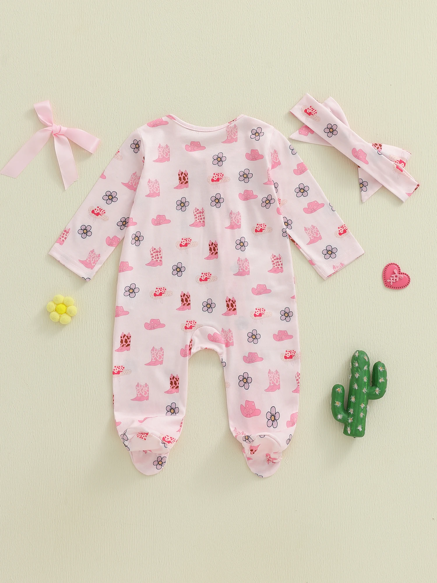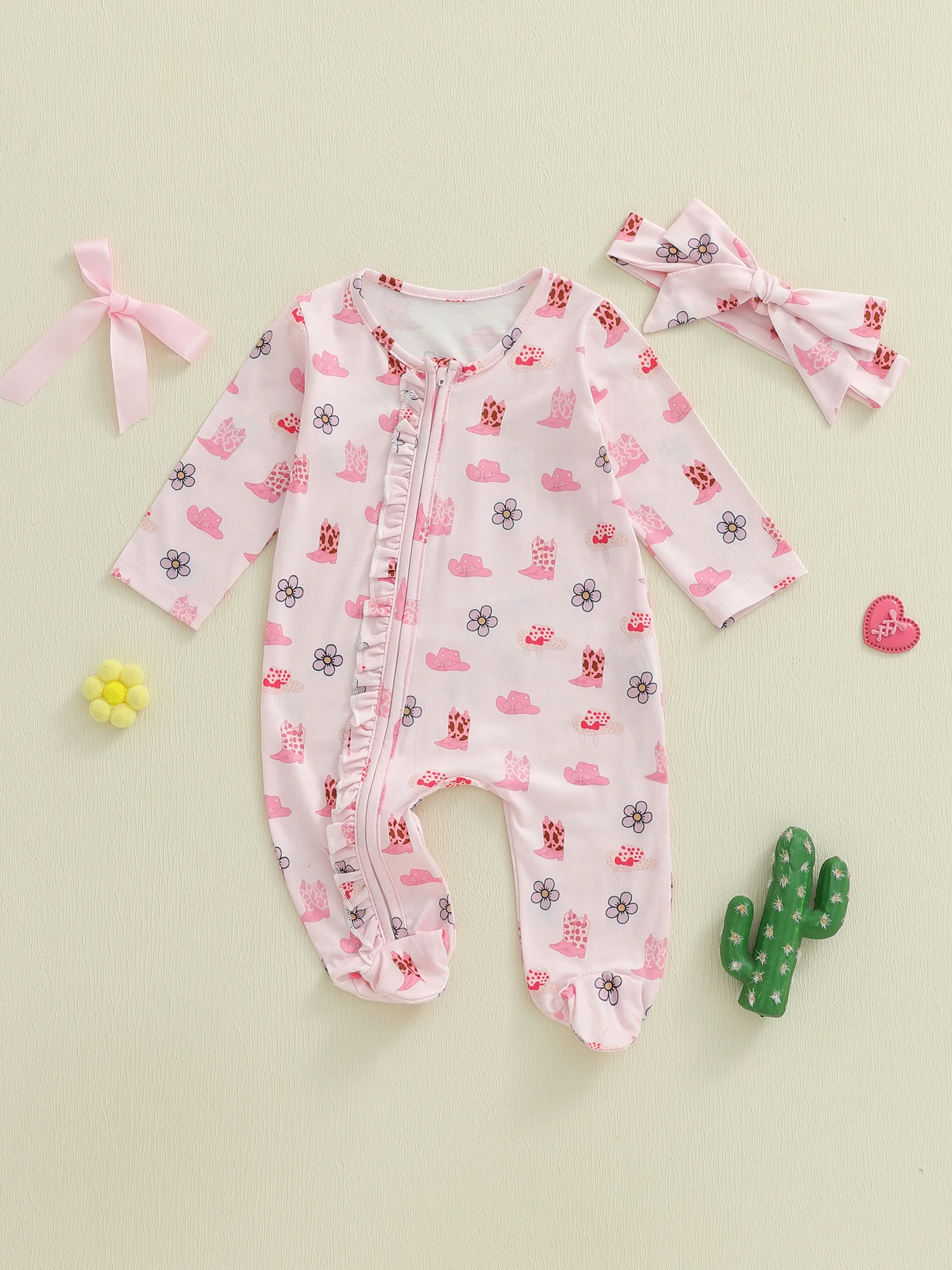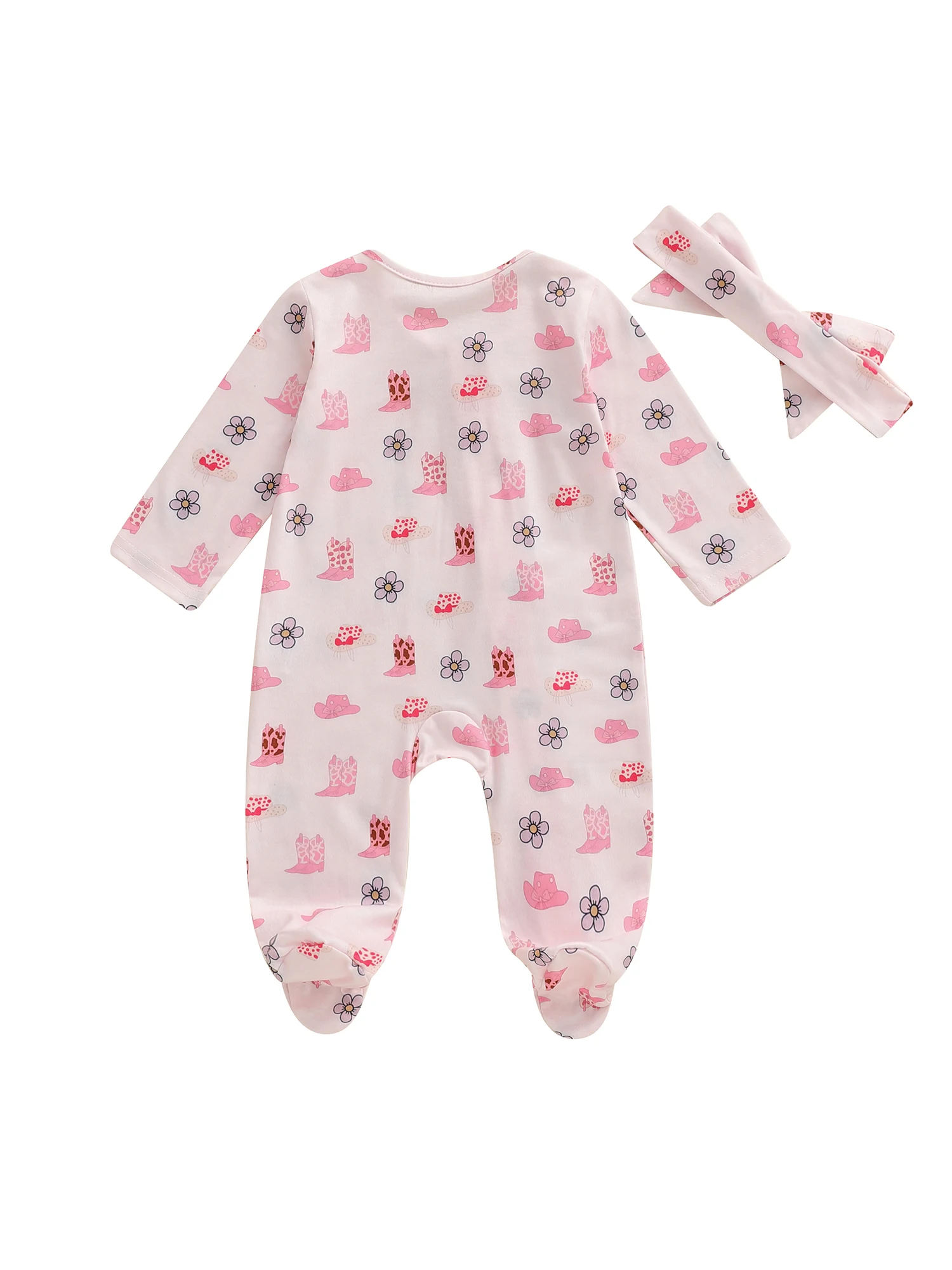 Bebé recién nacido niña otoño mameluco floral sombrero estampado manga larga cremallera cuello redondo mono con diadema