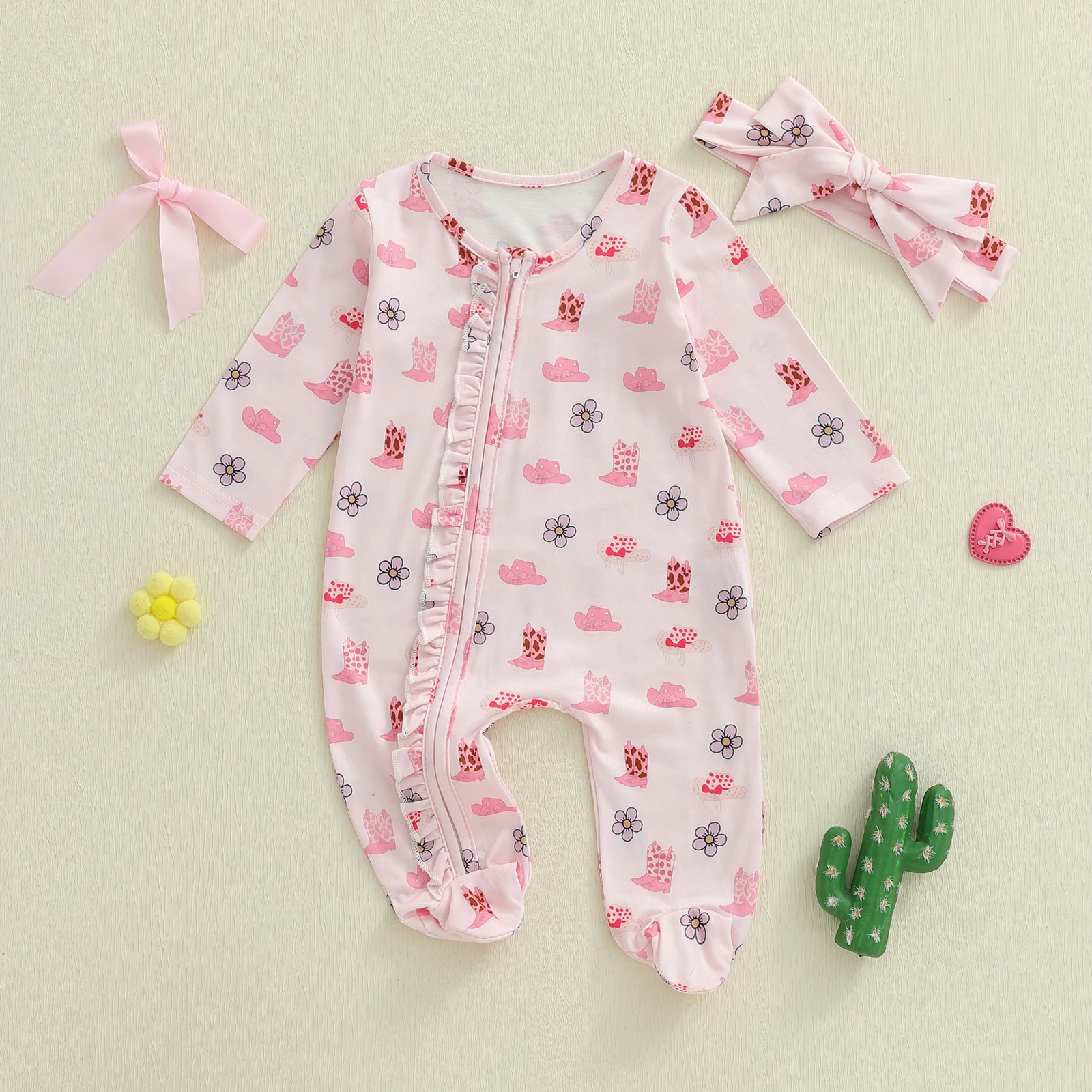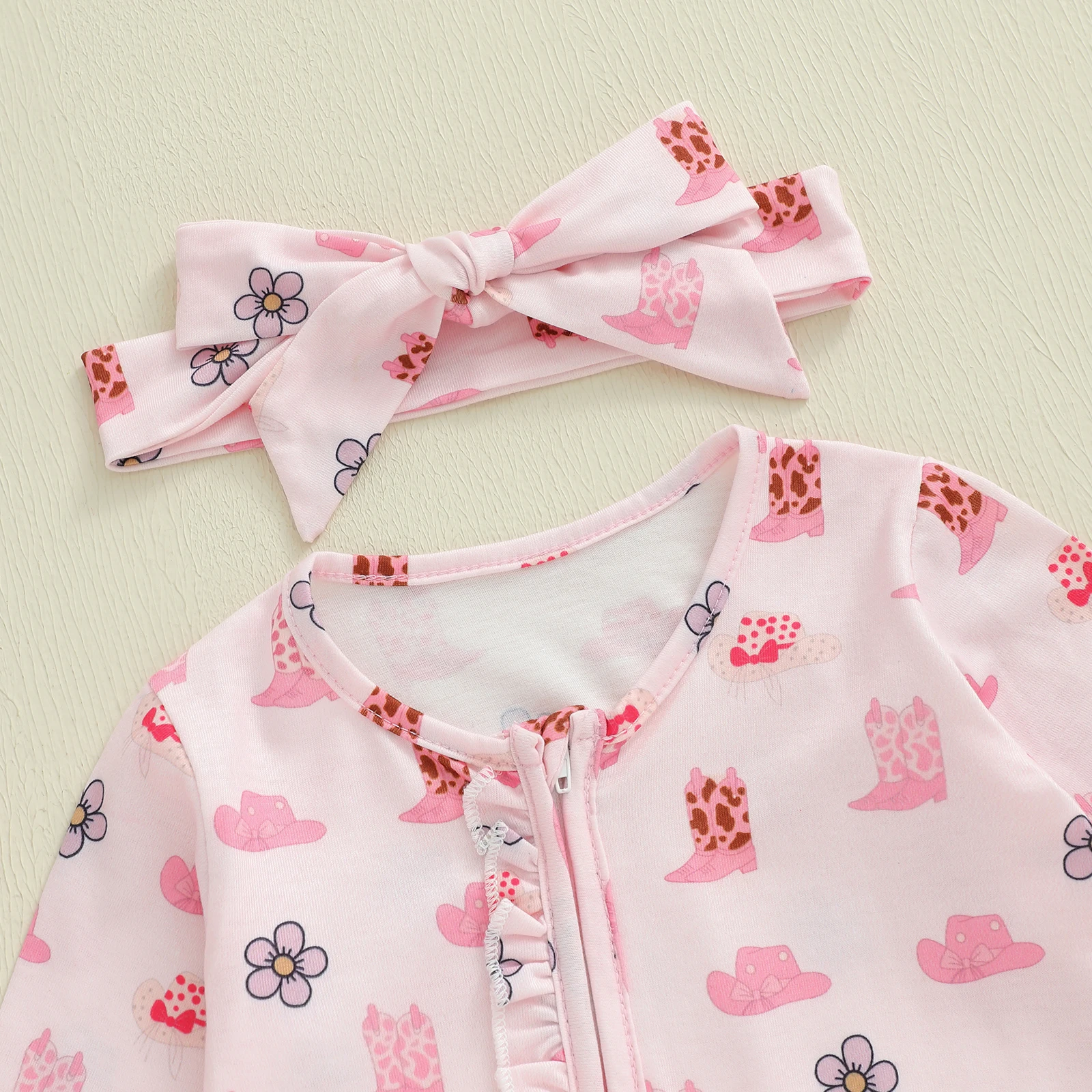Bebé recién nacido niña otoño mameluco floral sombrero estampado manga larga cremallera cuello redondo mono con diadema