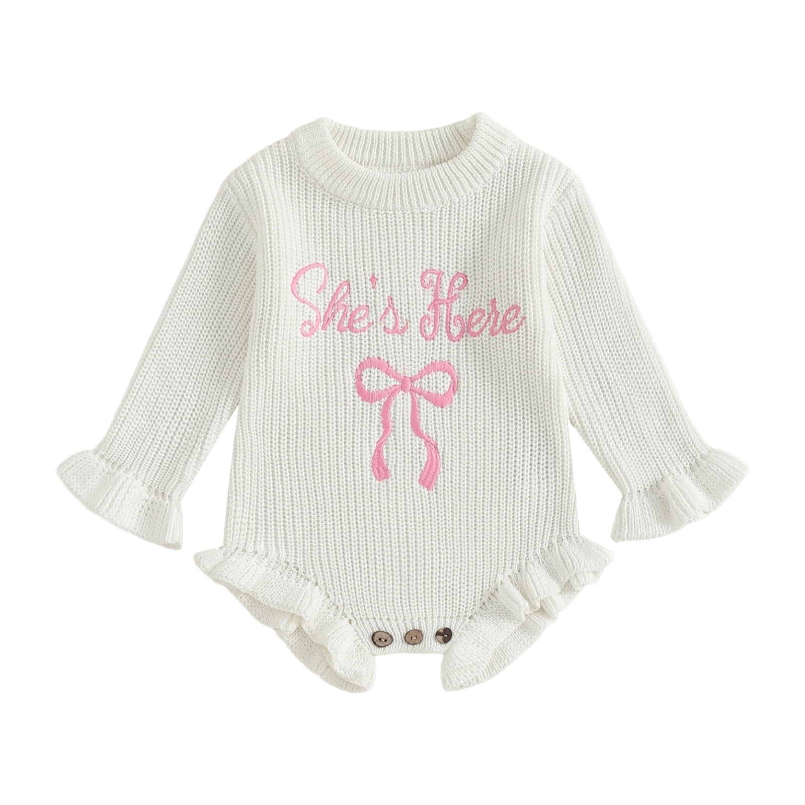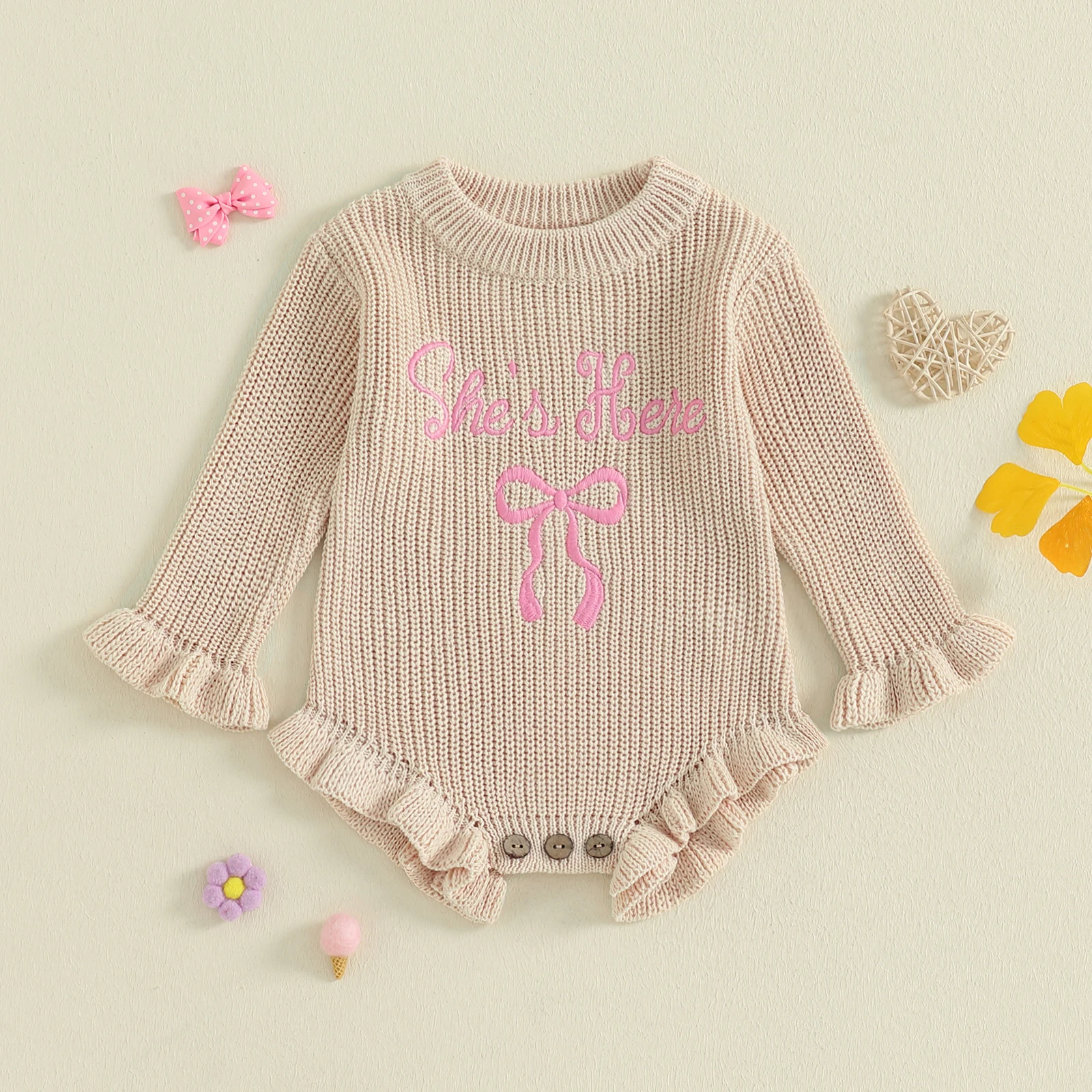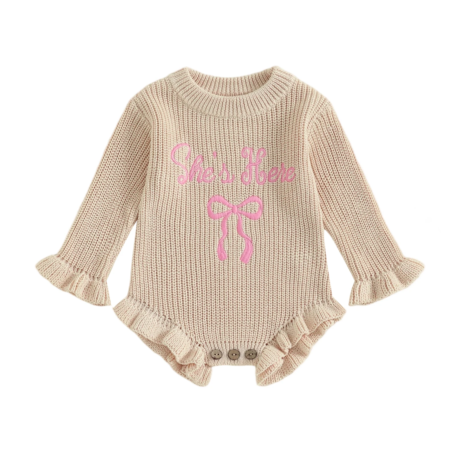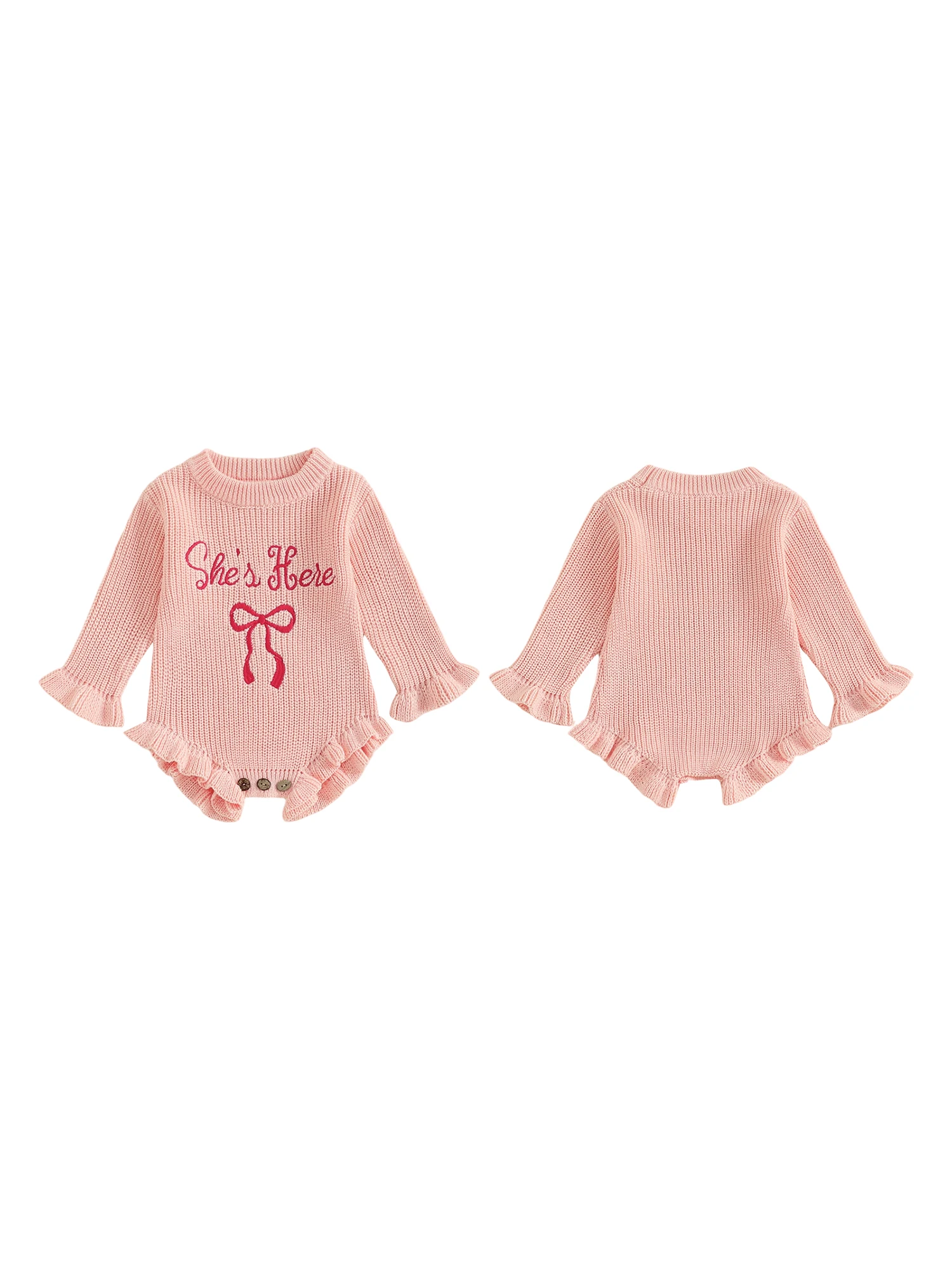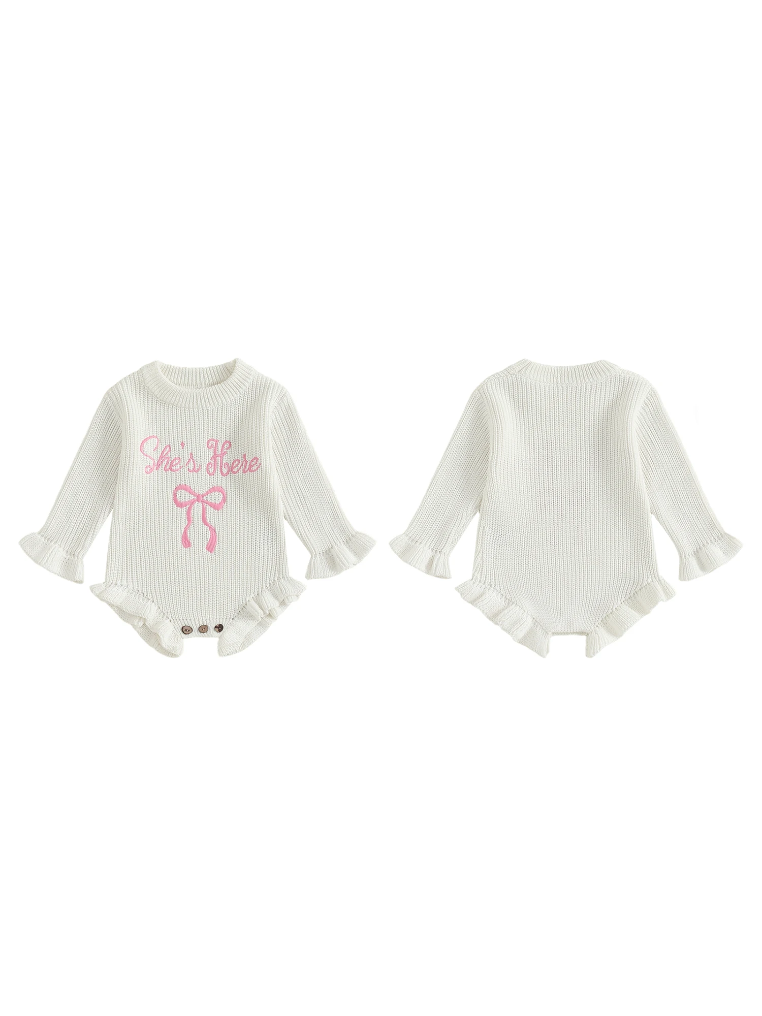 Mameluco de punto para niñas, suéter de manga larga con cuello redondo y letras con lazo bordado para uso diario informal