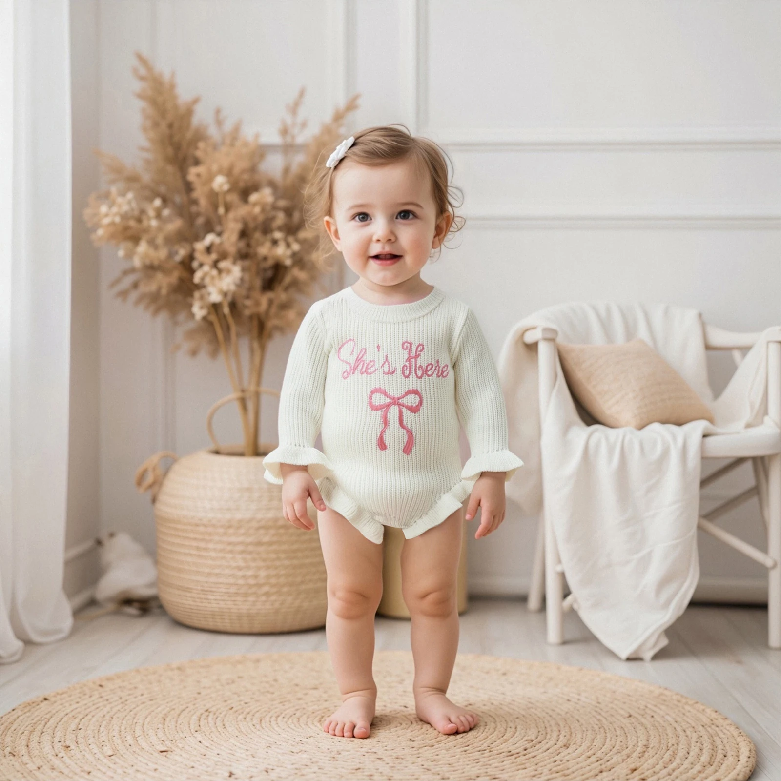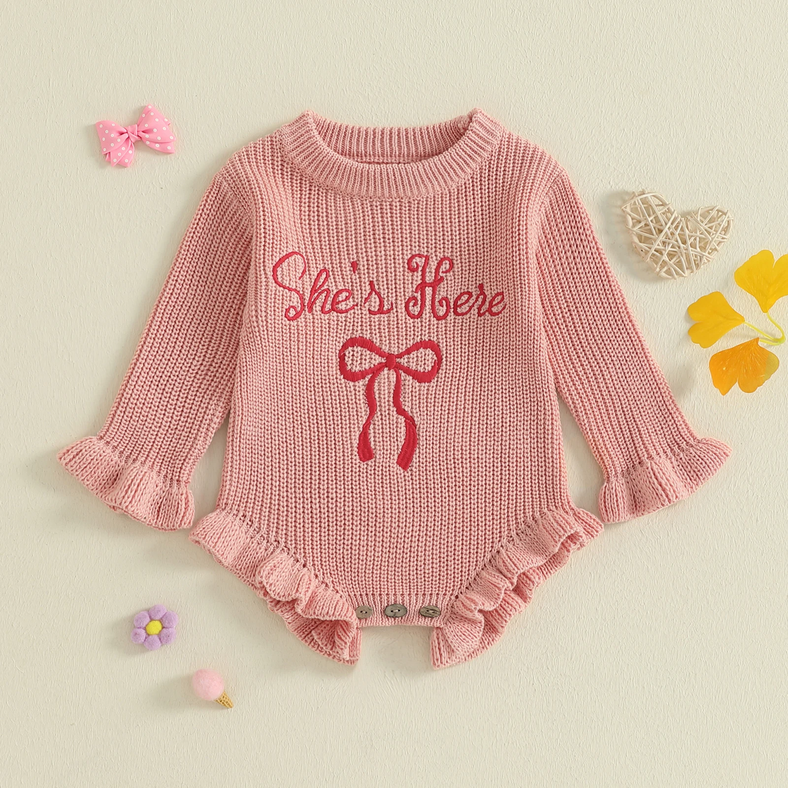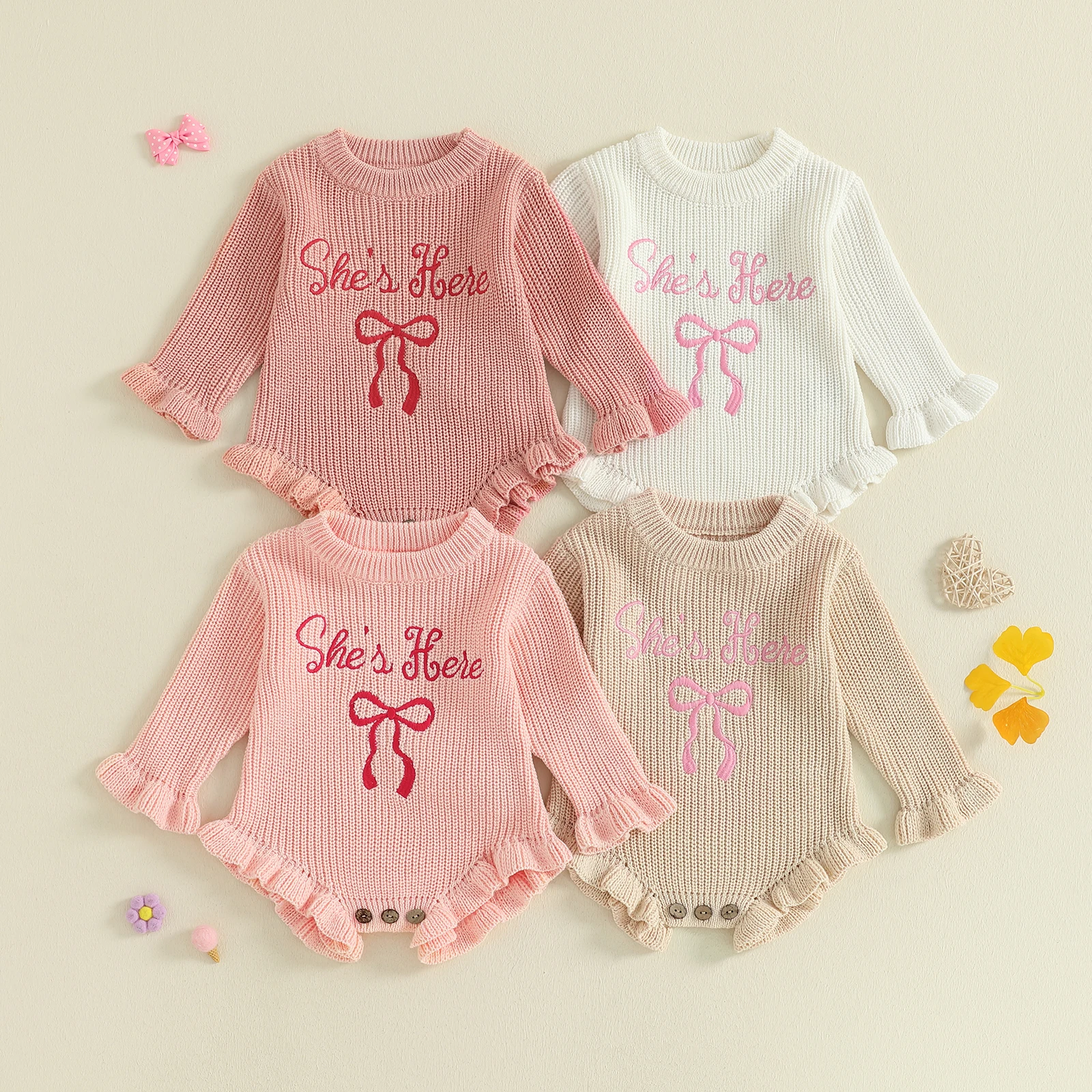 Mameluco de punto para niñas, suéter de manga larga con cuello redondo y letras con lazo bordado para uso diario informal