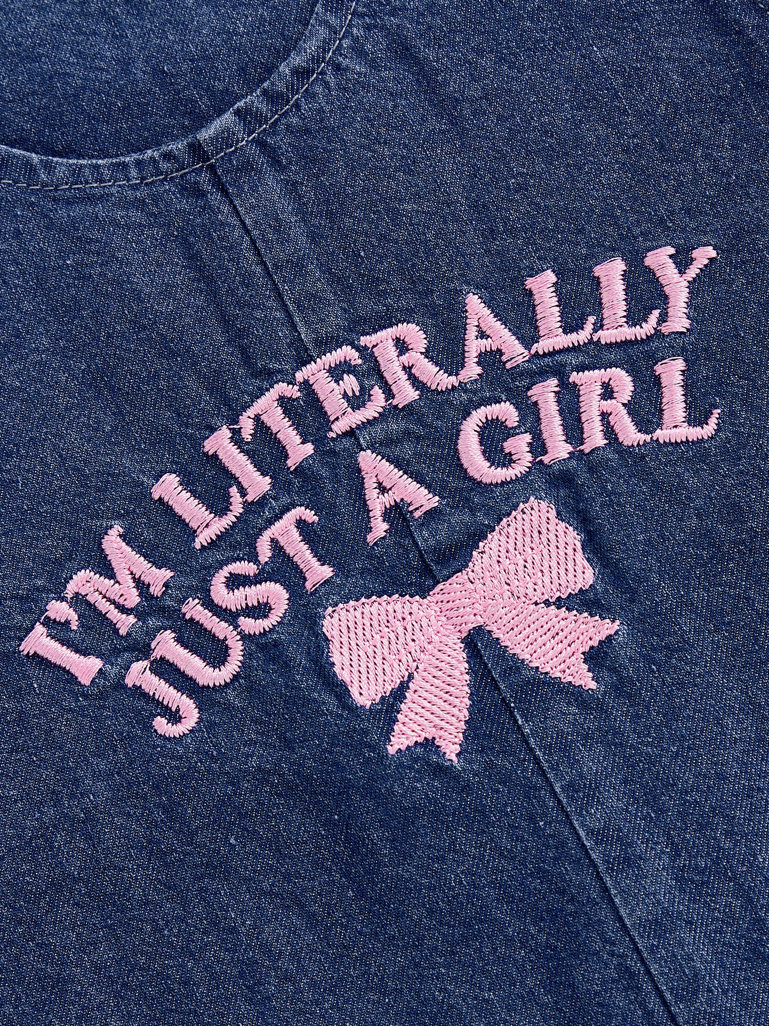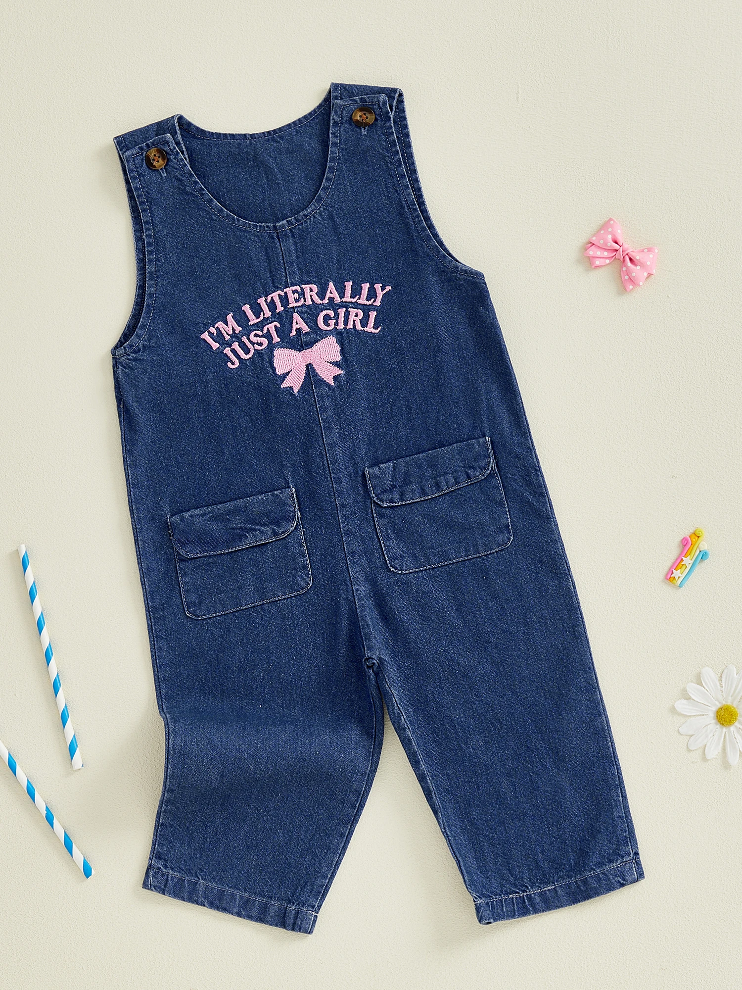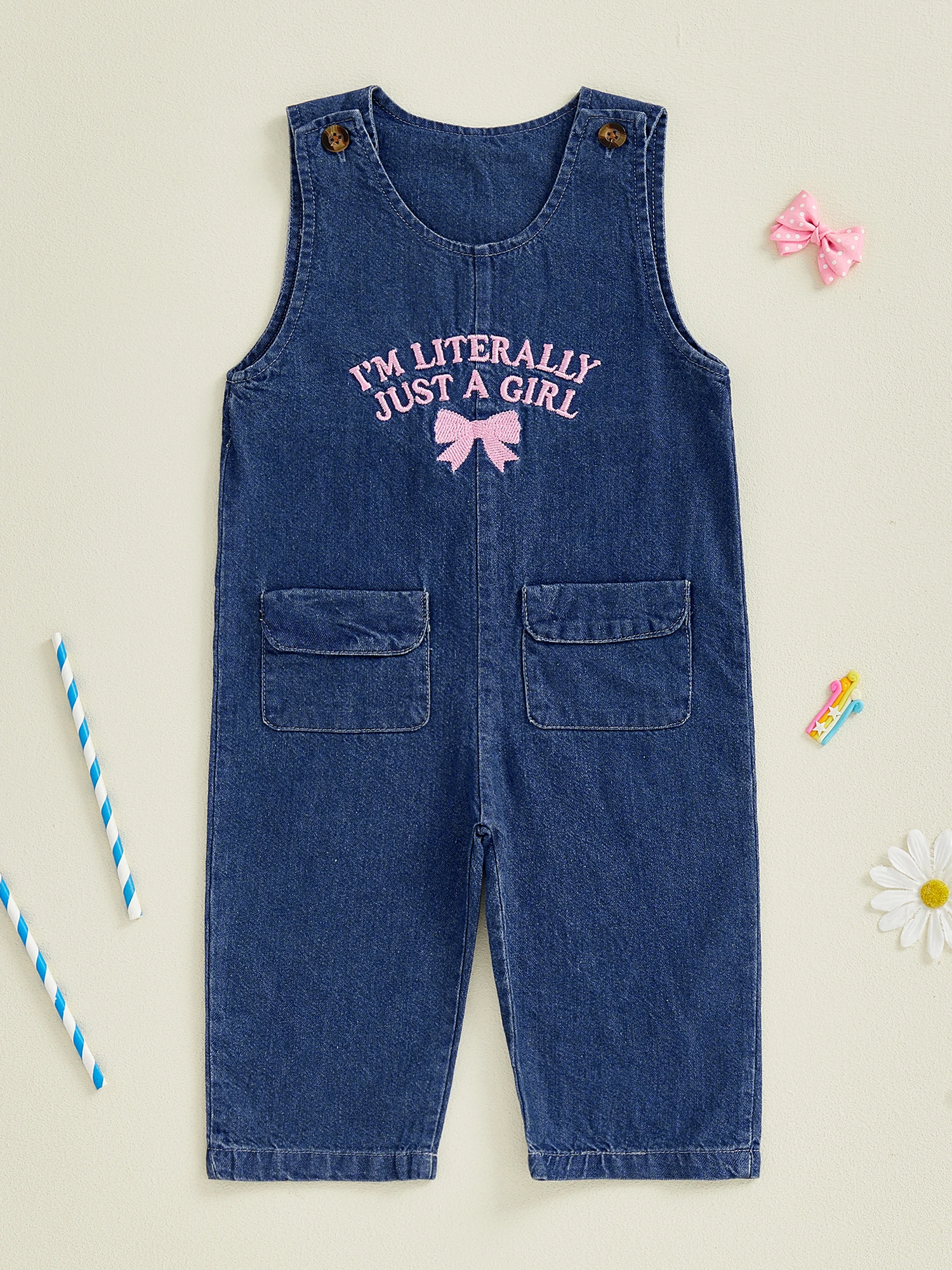 Mono para niña pequeña con letras lindas y bordado de lazo, sin mangas, cuello redondo, pantalones con bolsillos