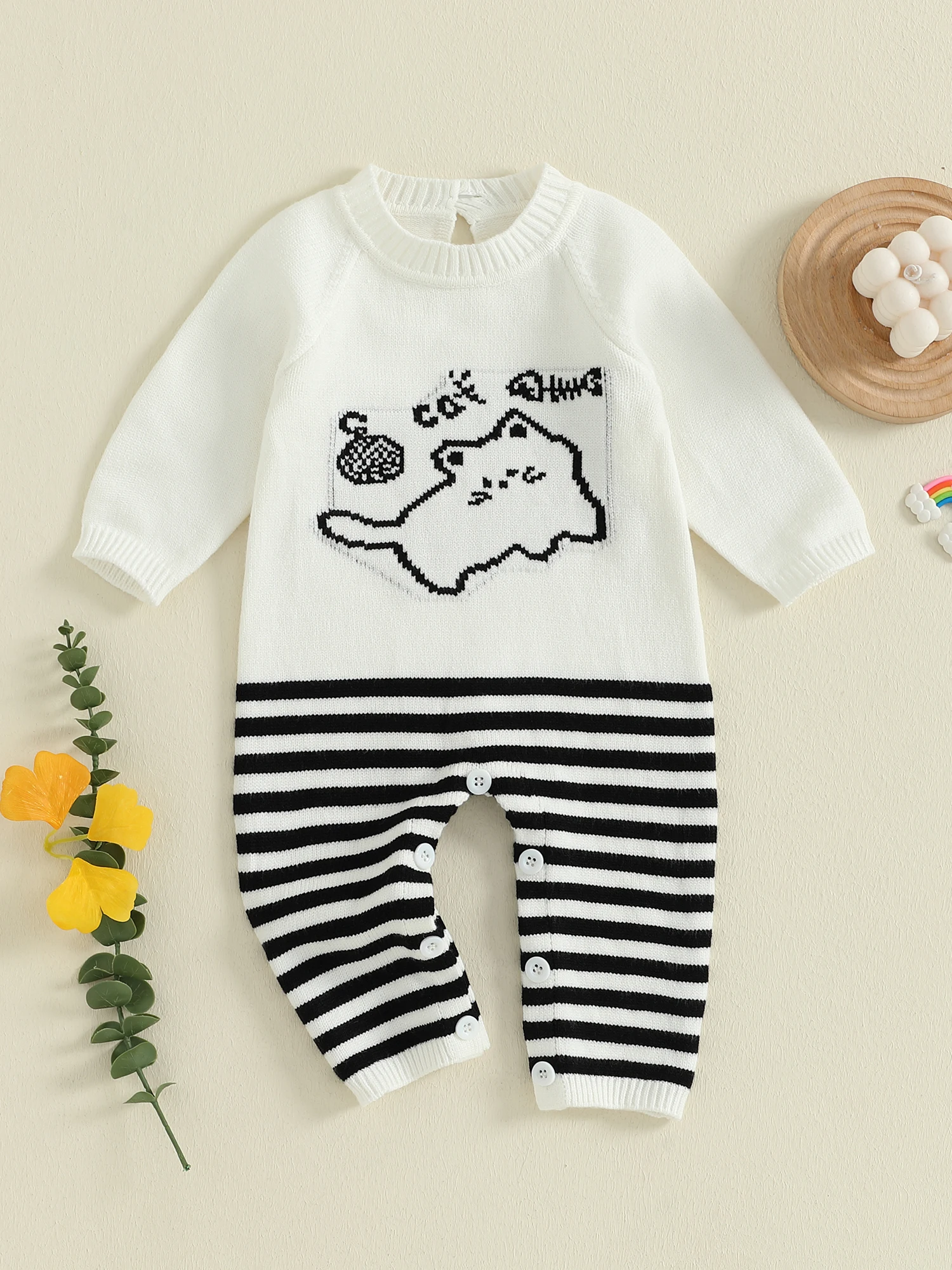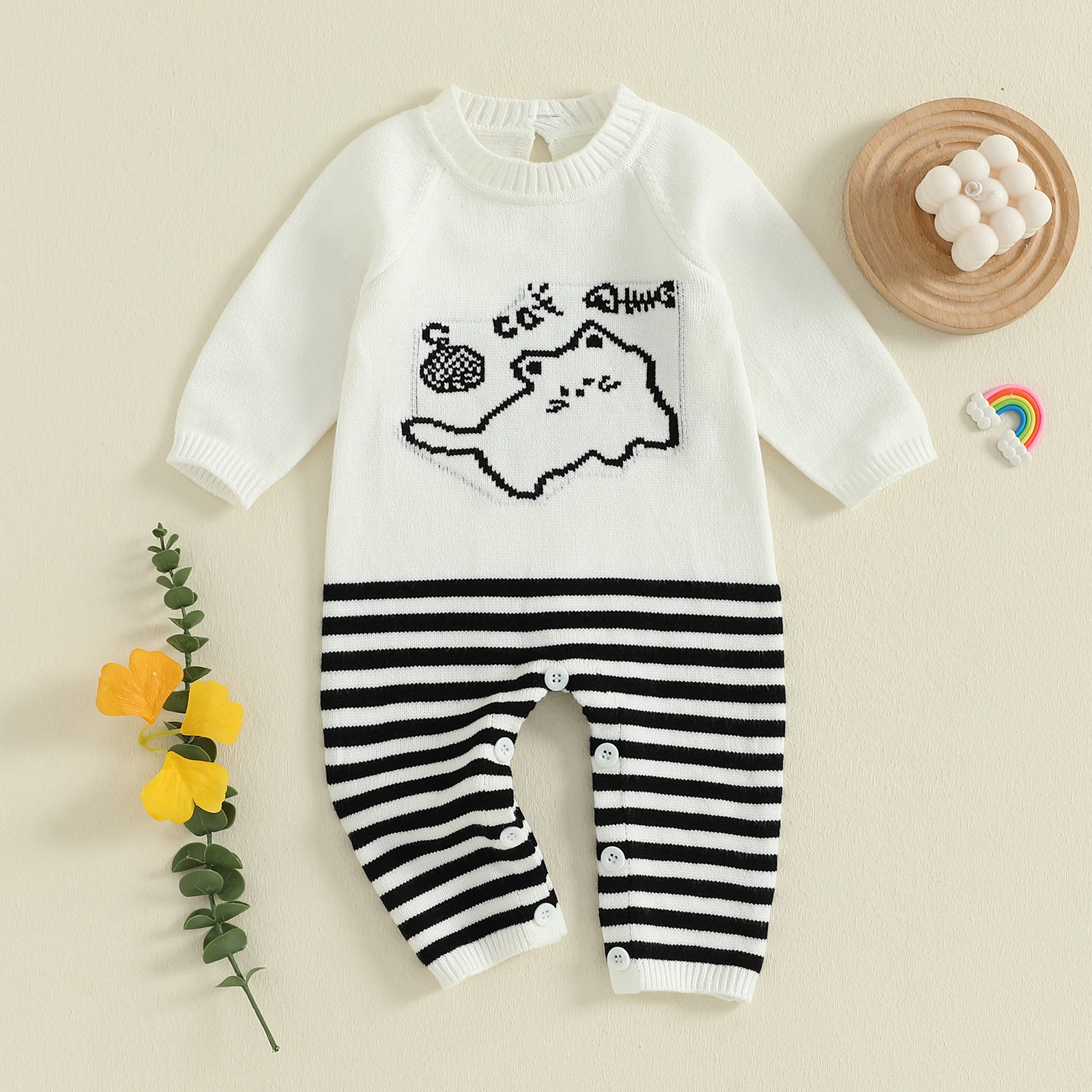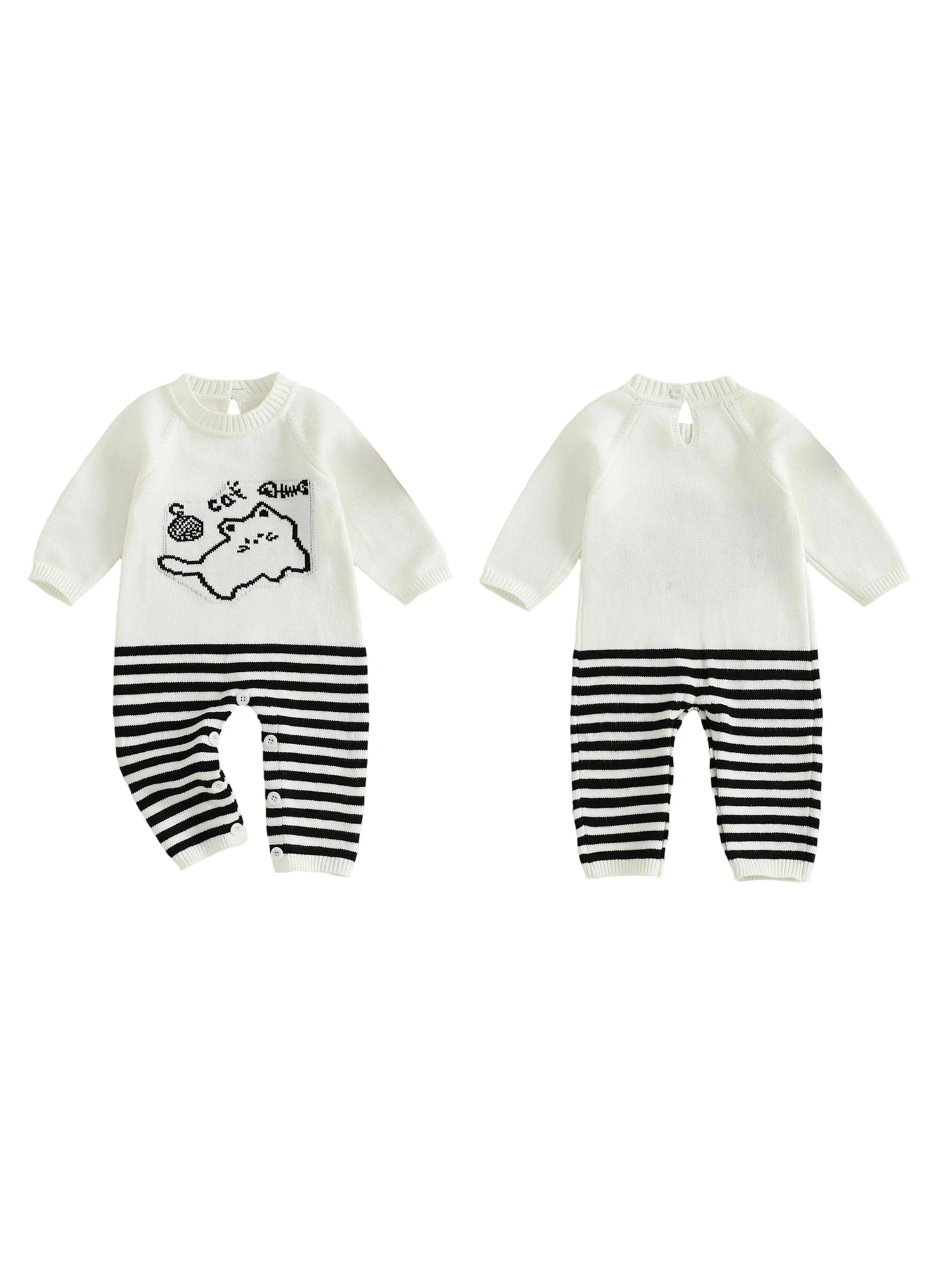 Mono informal para bebé, manga larga, cuello redondo, estampado de gato, mameluco de punto, traje sin pies para recién nacido