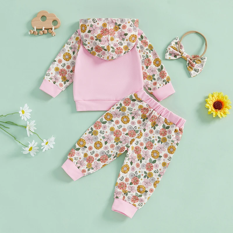 Conjuntos de otoño para niñas bebés, Sudadera con capucha de manga larga con estampado floral y pantalones elásticos, diadema, conjunto de ropa de 3 piezas