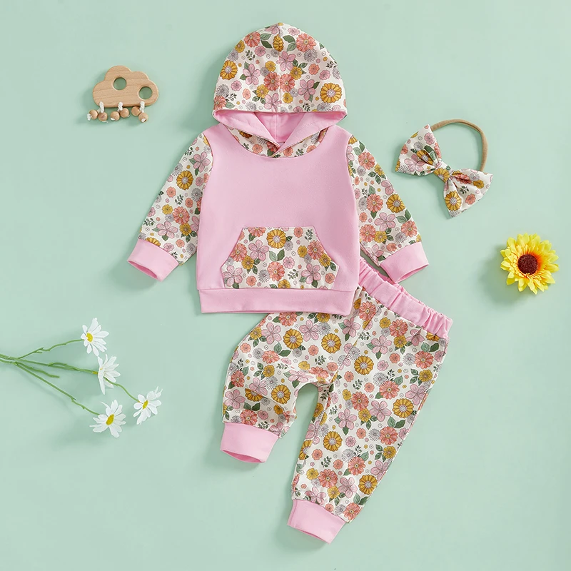 Traje de moda para niñas con estampado floral. Sudadera de bebé niña con manga larga, capucha, diseño de bolsillo delantero. Pantalones de niña con diseño de cintura elástica y lindo conjunto de diadema, haga que su pequeño esté a la moda, lindo y encantador.