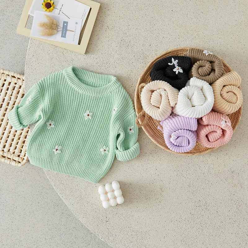 Suéter para niña, suéter de punto cálido de invierno con flores de cuello redondo de manga larga, ropa infantil