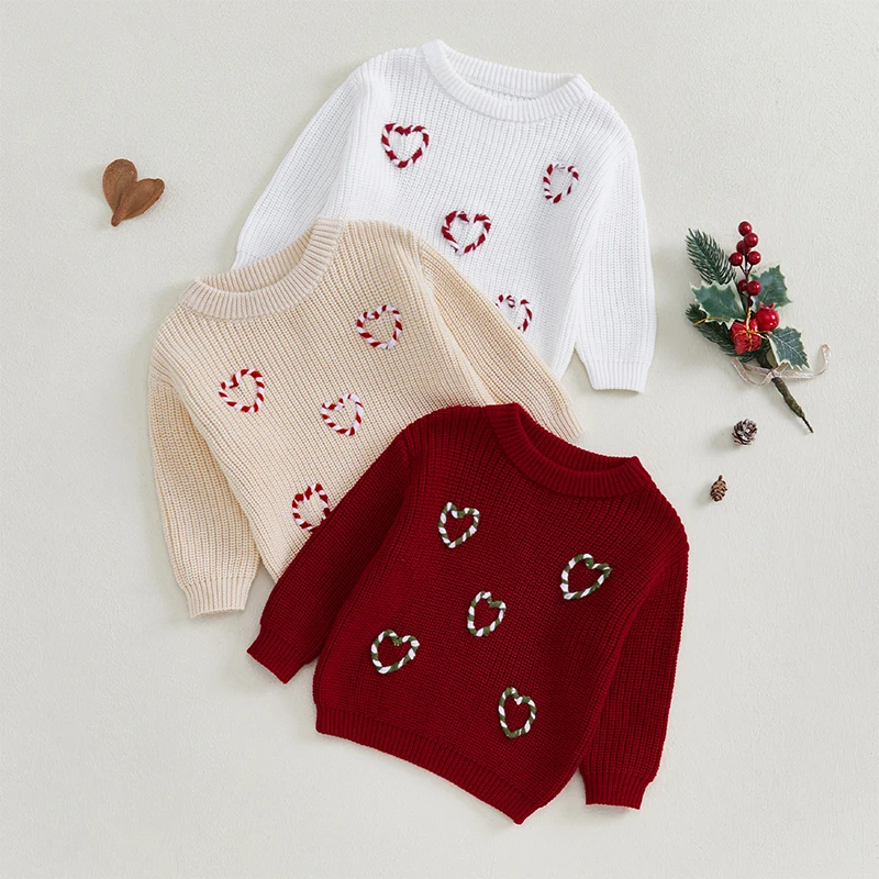 Suéteres de Navidad para bebés, jerséis de punto con bordado de bastón de caramelo en forma de corazón de manga larga, jerséis infantiles