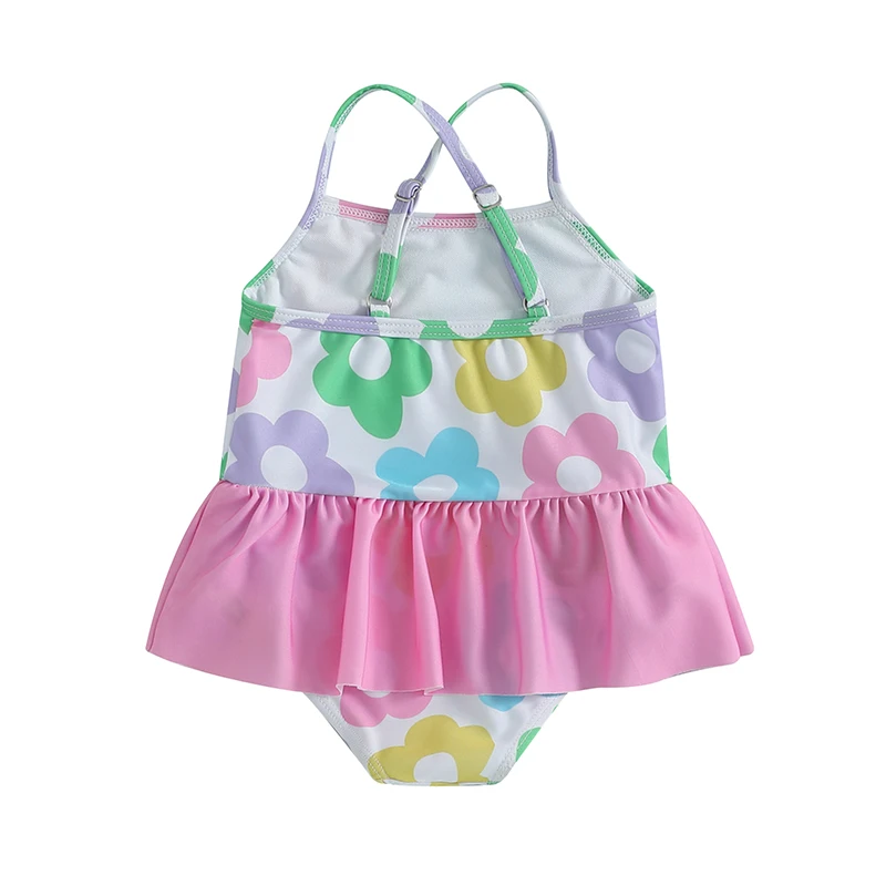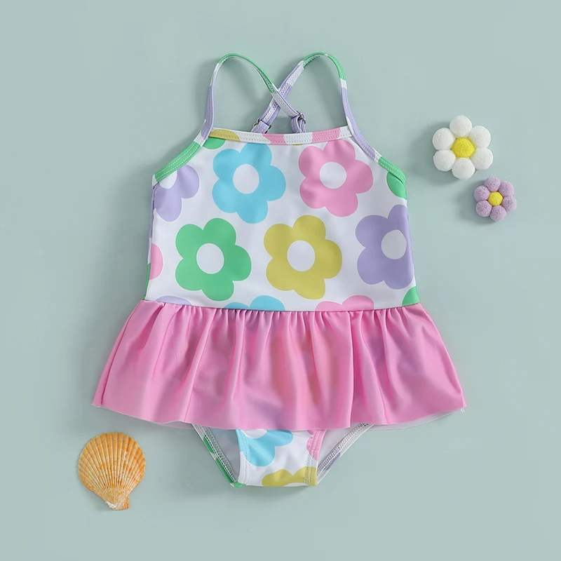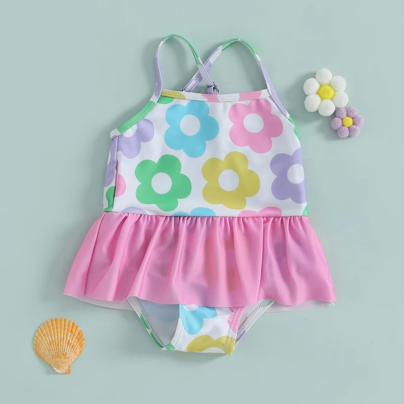Trajes de baño para niñas con estampado floral y tirantes cruzados, sin mangas, con volantes, trajes de baño para niños pequeños, ropa de playa
