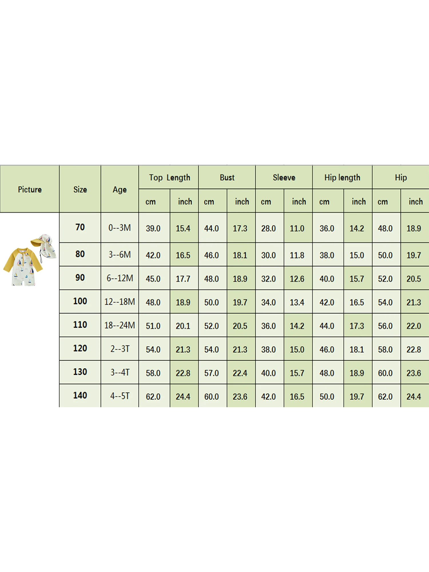 70 Longitud: 15,35 Busto: 17.32 Manga: 11,02 Cadera: 18,9 Edad recomendada: 0-3 meses