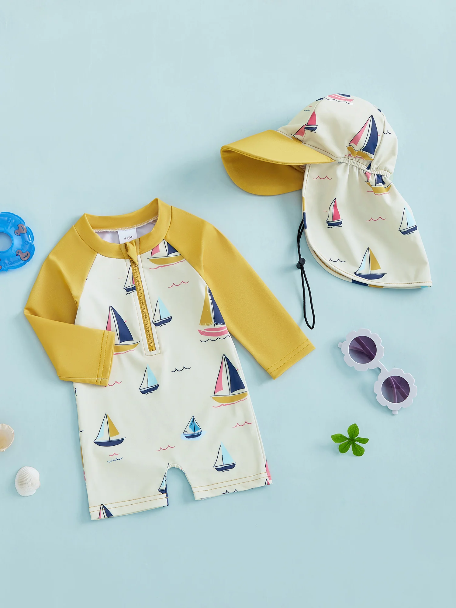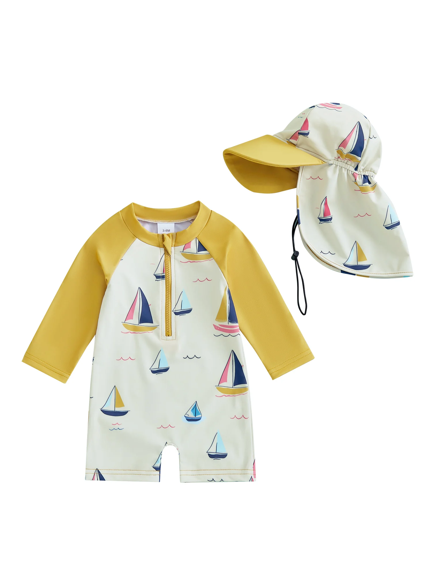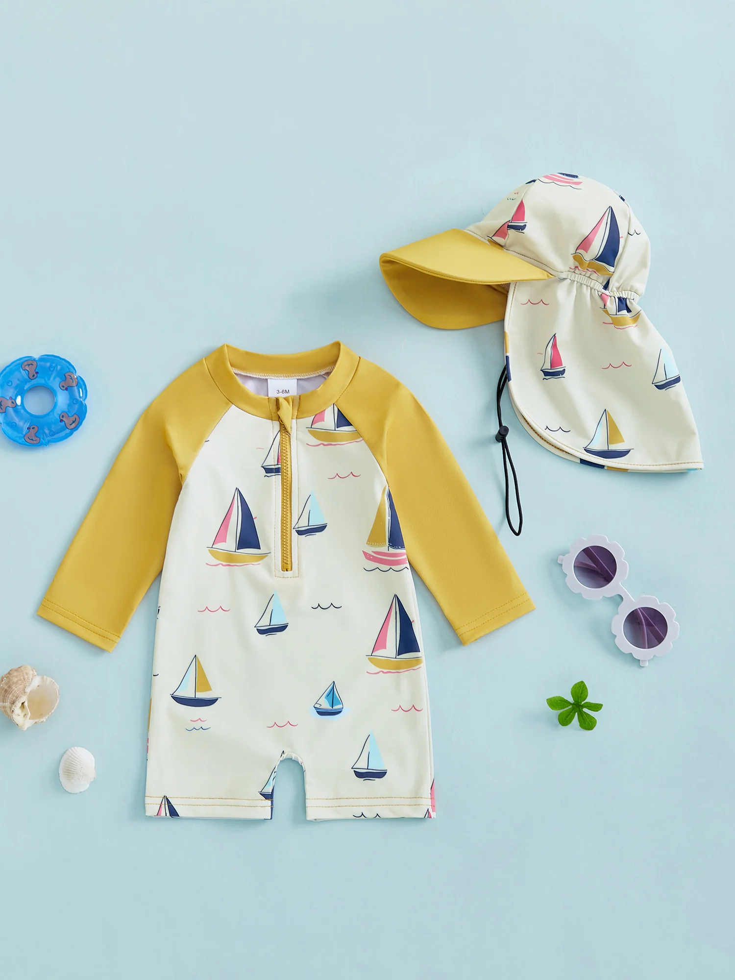 Traje de baño protector contra sarpullidos para niño pequeño con sombrero, conjunto de 2 uds., velero estampado con cremallera, manga larga, cuello redondo, trajes de baño para bebé