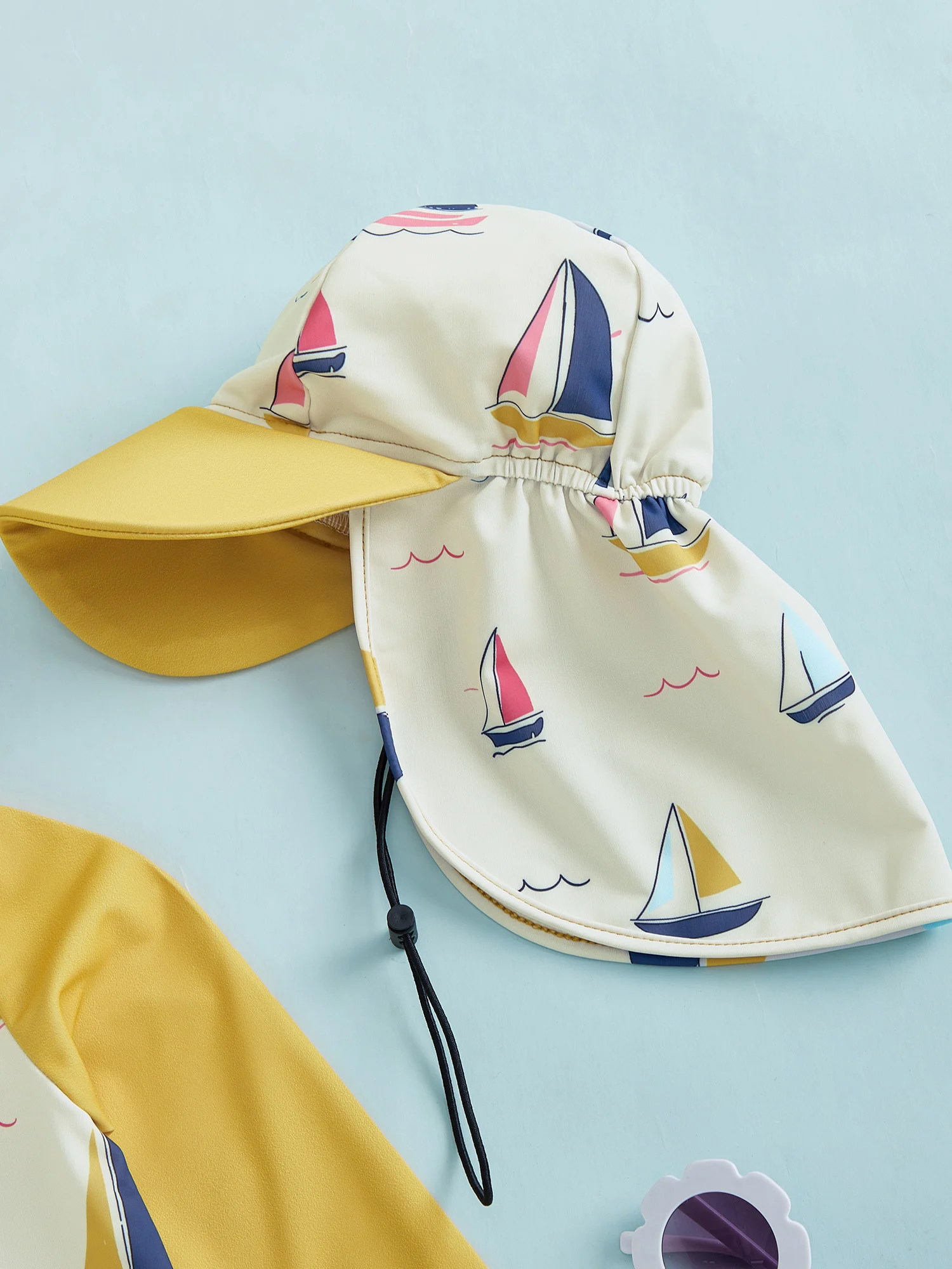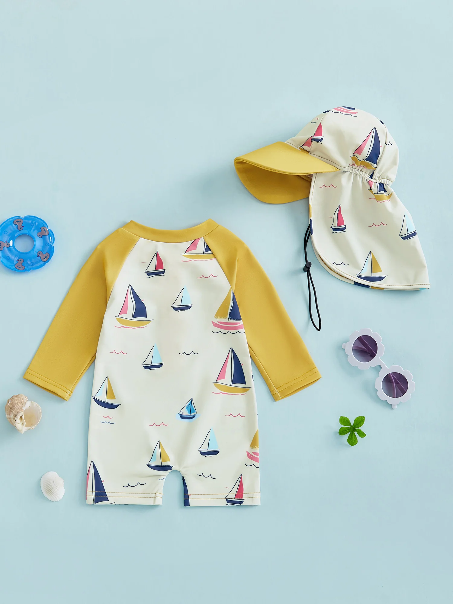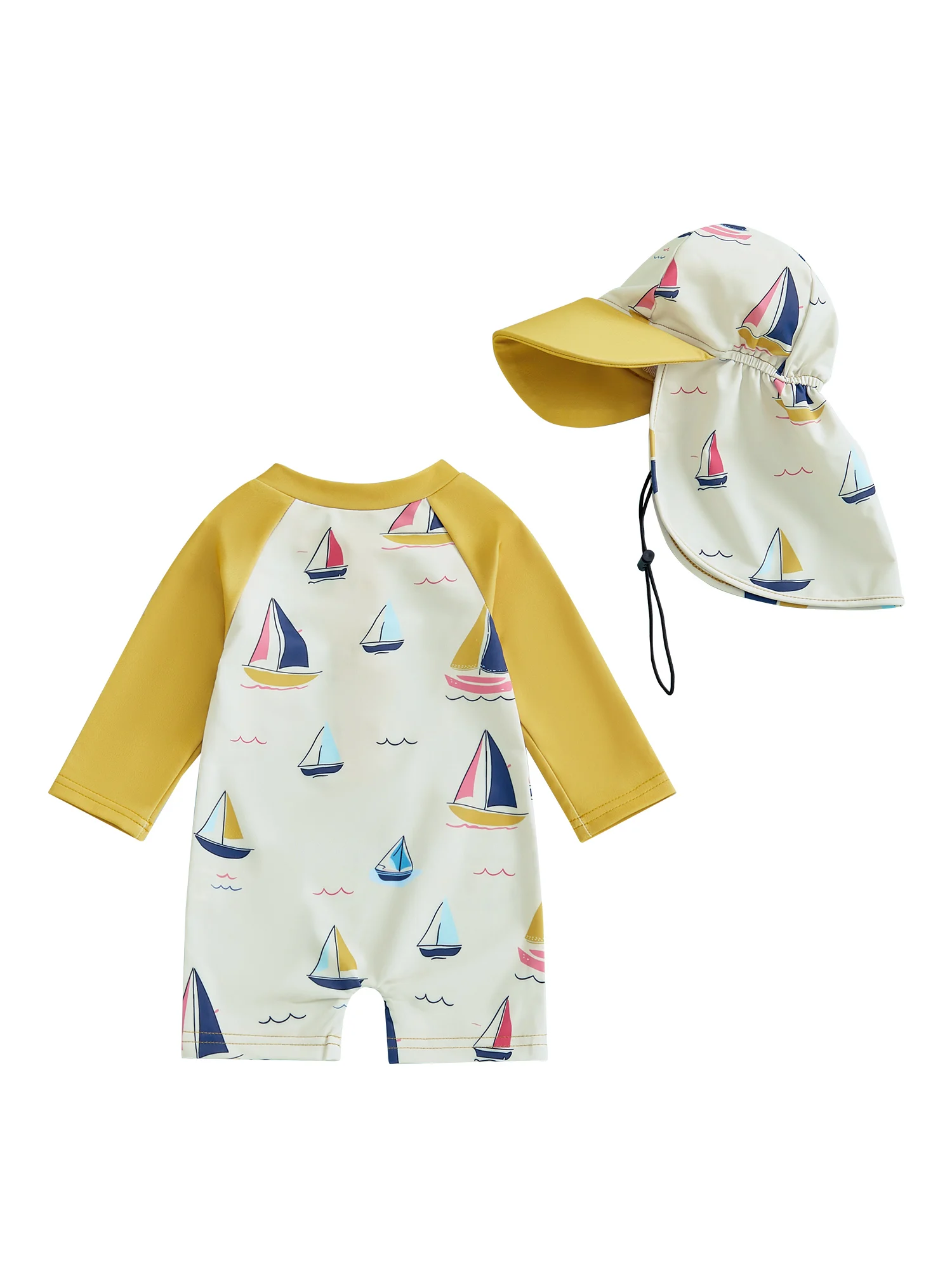 Traje de baño protector contra sarpullidos para niño pequeño con sombrero, conjunto de 2 uds., velero estampado con cremallera, manga larga, cuello redondo, trajes de baño para bebé