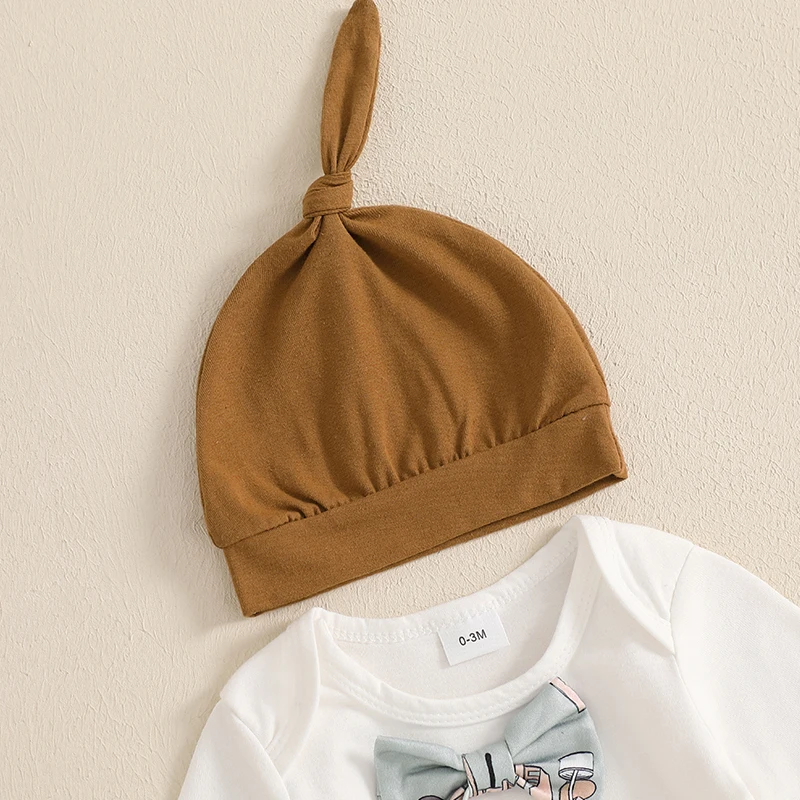 Conjunto de 3 piezas de traje de Pascua para bebé niño, pelele con pajarita de manga larga, pantalones con tirantes de camión, sombrero anudado sólido