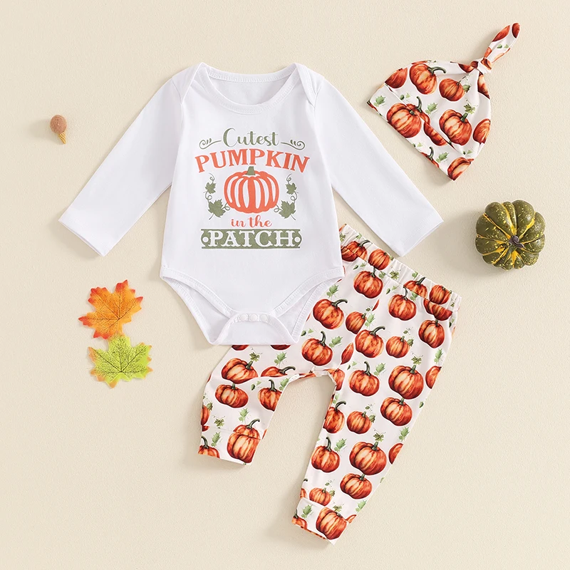 Trajes de Halloween para bebés, peleles de manga larga con cuello redondo y estampado de letras, pantalones largos con estampado de calabaza, sombrero, conjunto de ropa de Otoño de 3 piezas
