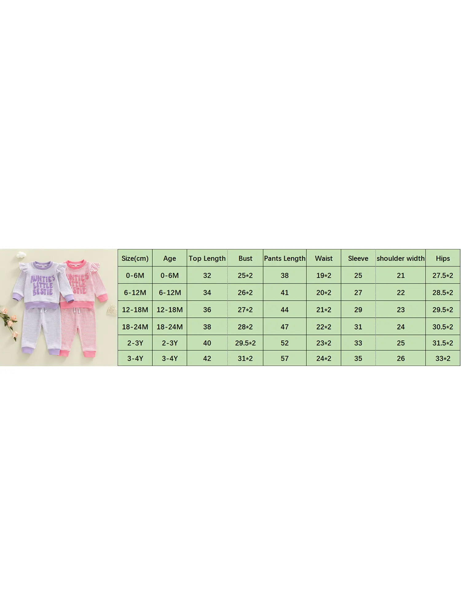 0-6M Longitud de la parte superior: 32 Busto: 50 Longitud de pantalones: 38 Cintura: 38 Manga: 25 Ancho de hombros: 21 Cadera: 55 Edad recomendada: 0-6 meses
