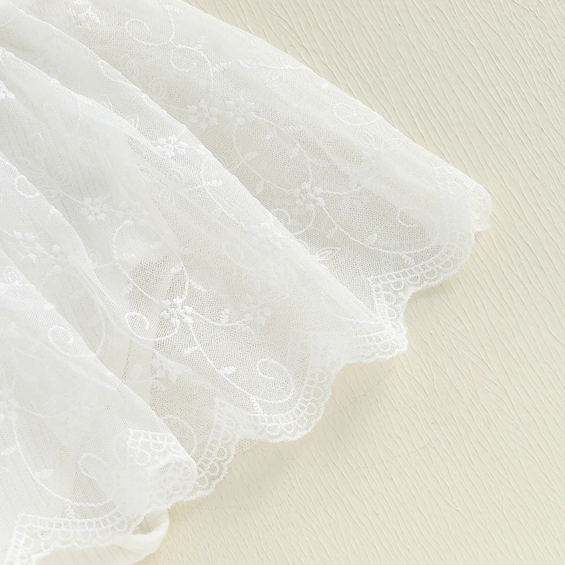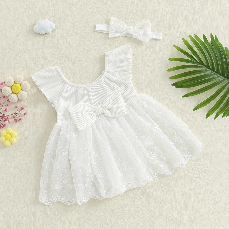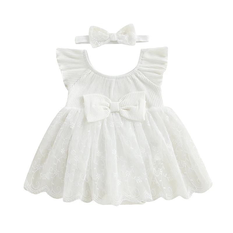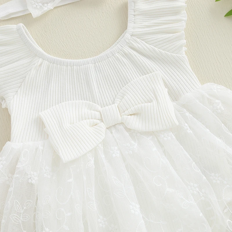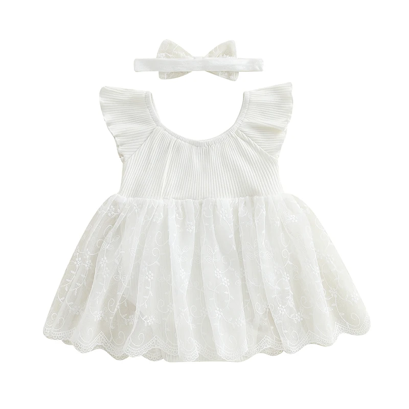 Vestido mameluco de verano para niñas, mameluco de encaje de manga corta con cuello redondo y diadema