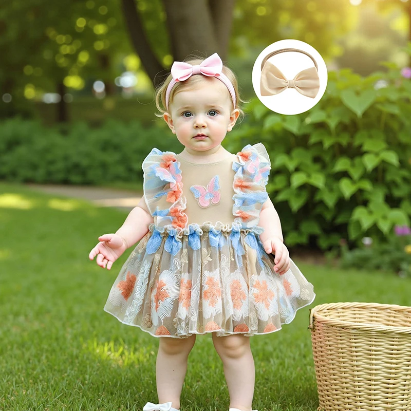 Vestido mameluco de verano para niñas, manga aleteada, cuello redondo, bordado de mariposas florales, mono de malla con diadema