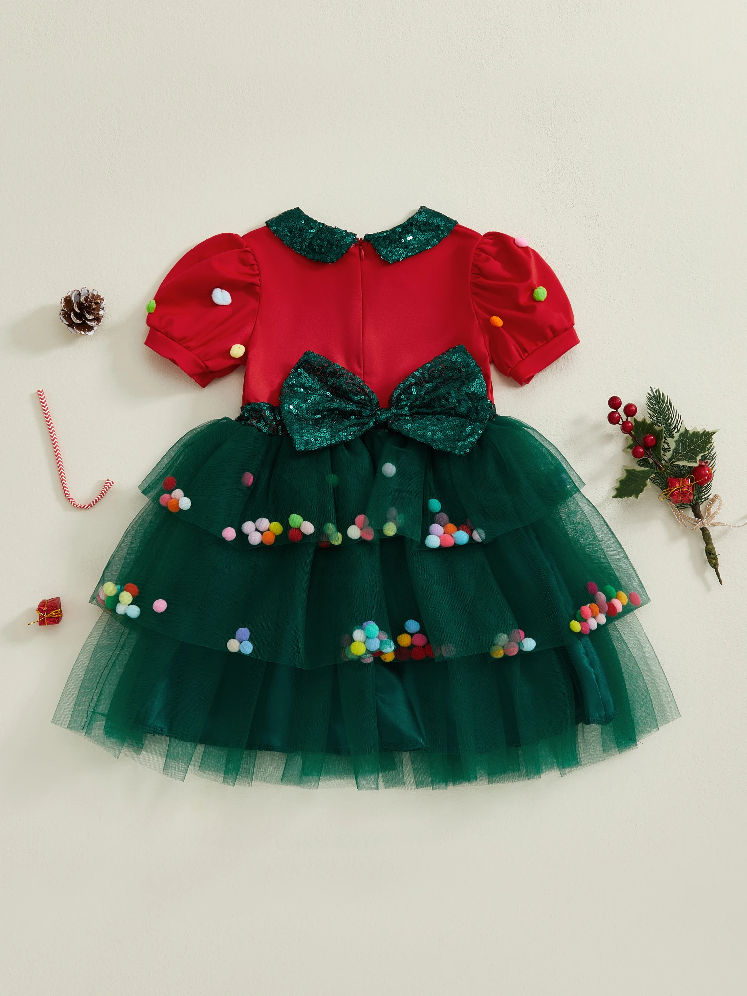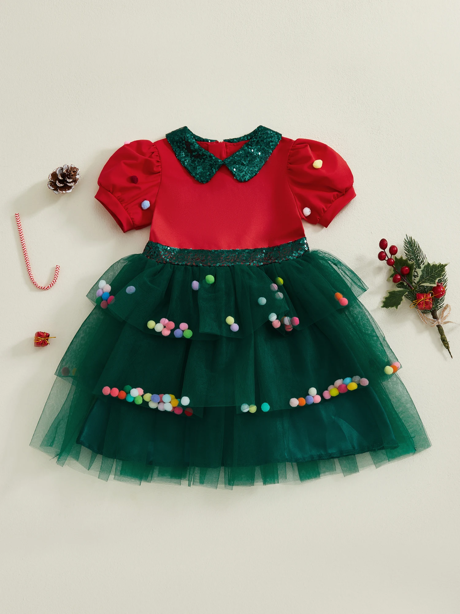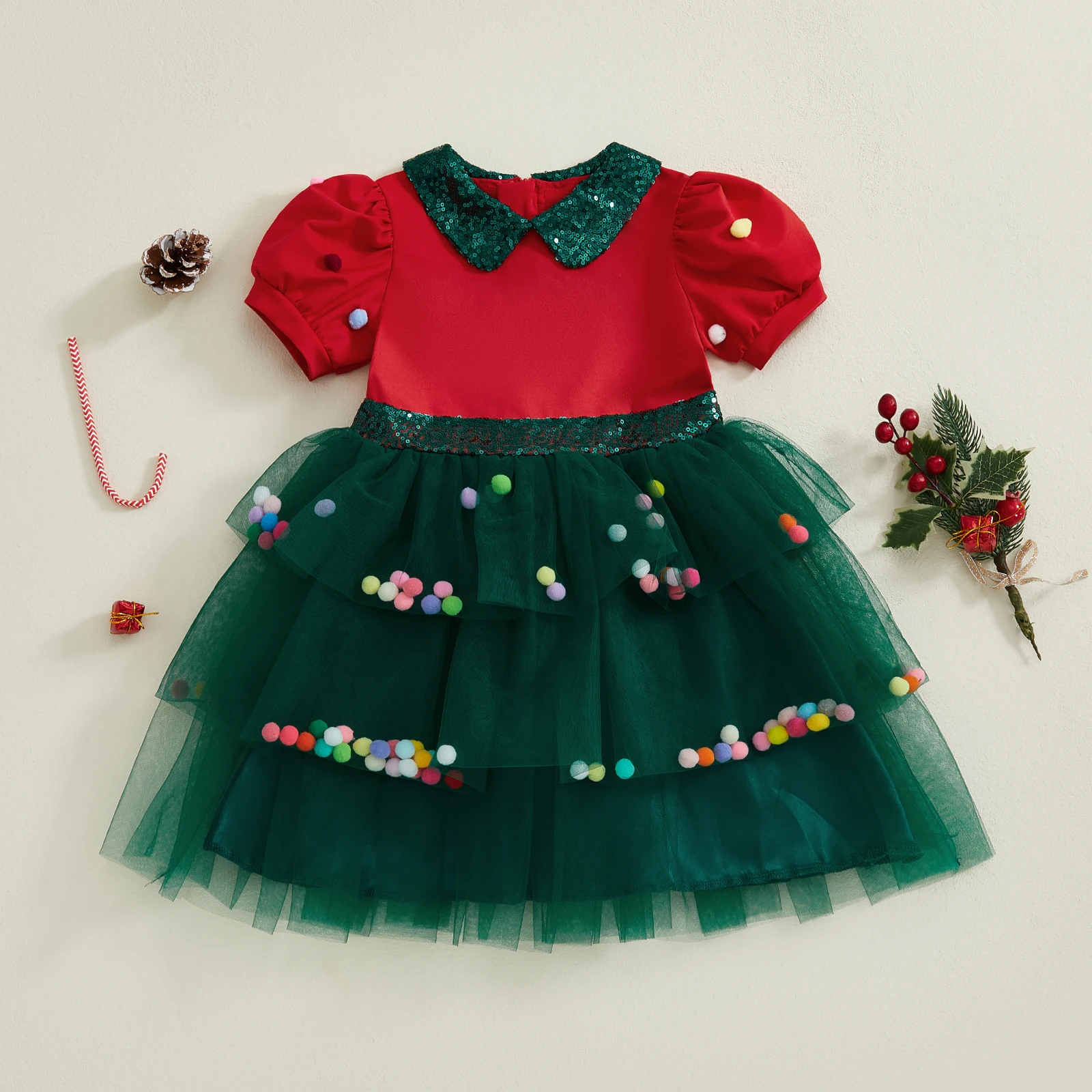 Vestido de Navidad de una línea para niña pequeña, vestido de retales de tul con mangas cortas abullonadas y cuello de muñeca de lentejuelas