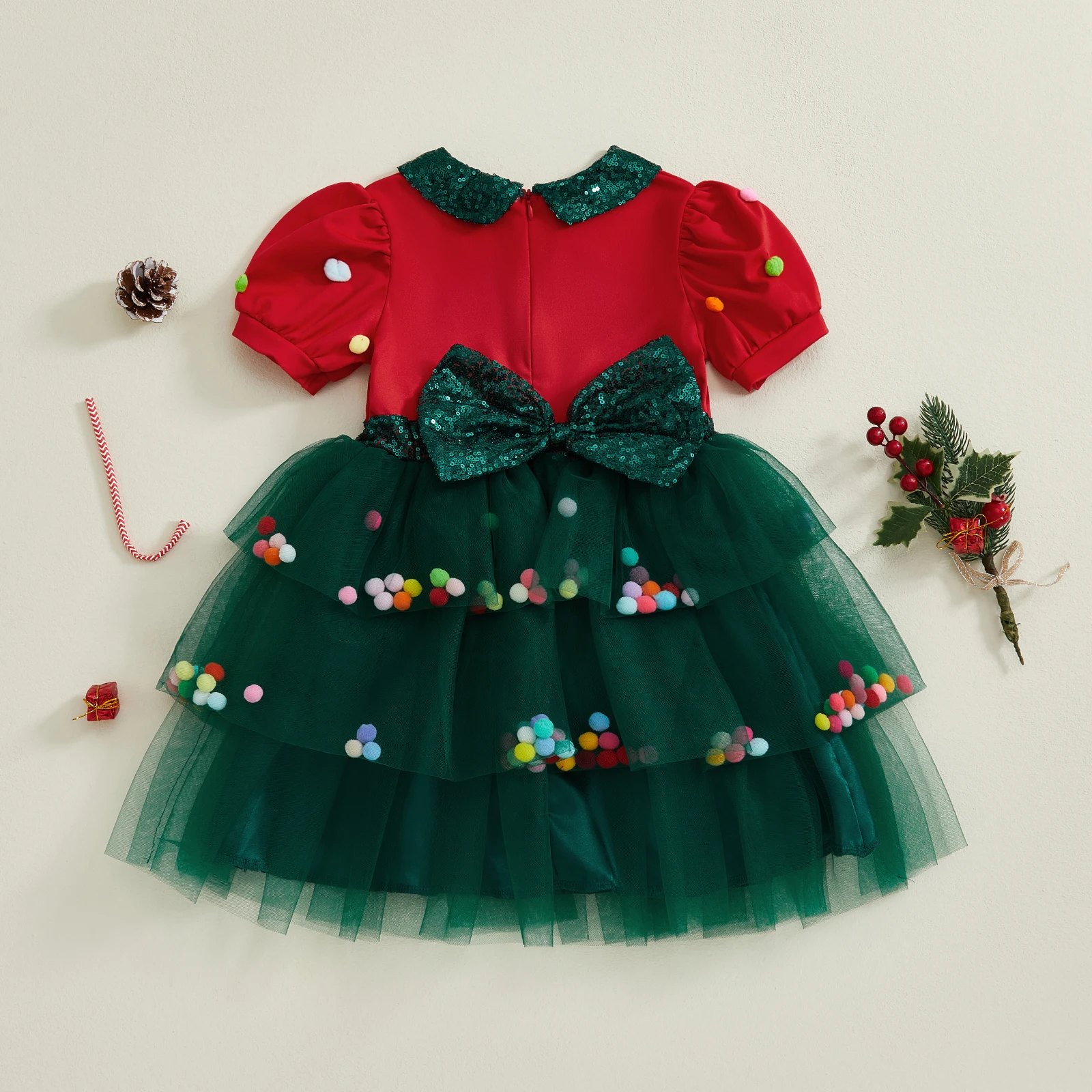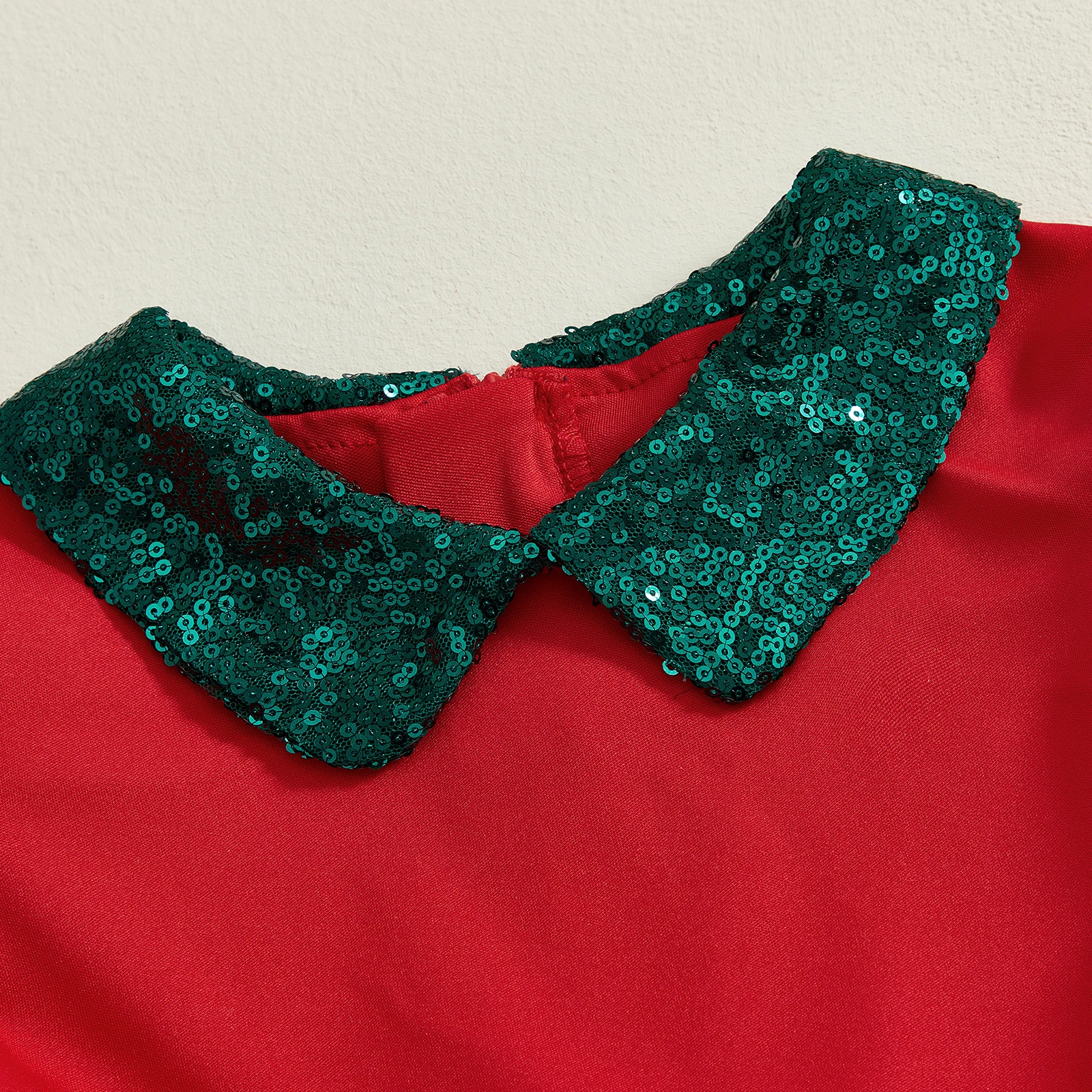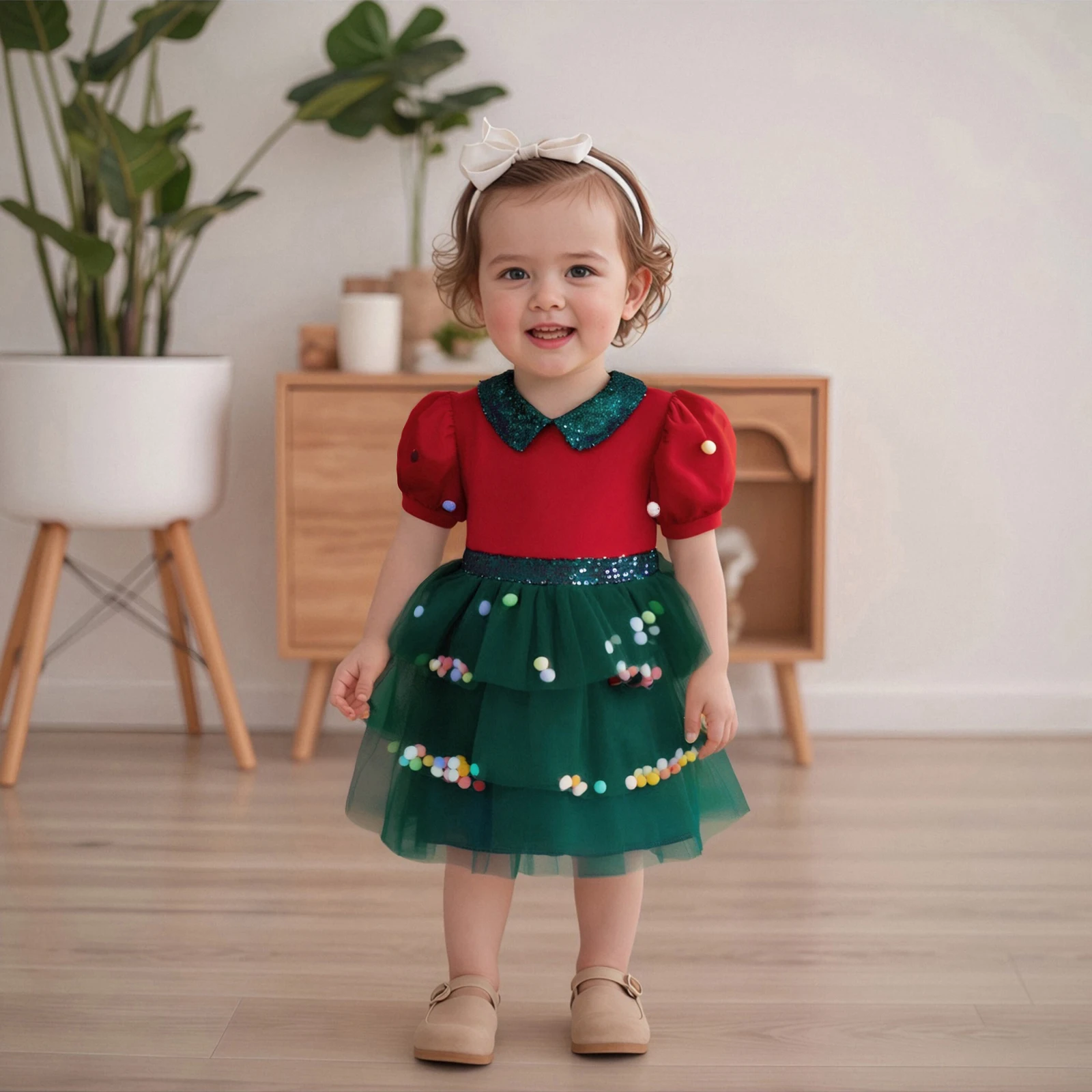 Vestido de Navidad de una línea para niña pequeña, vestido de retales de tul con mangas cortas abullonadas y cuello de muñeca de lentejuelas