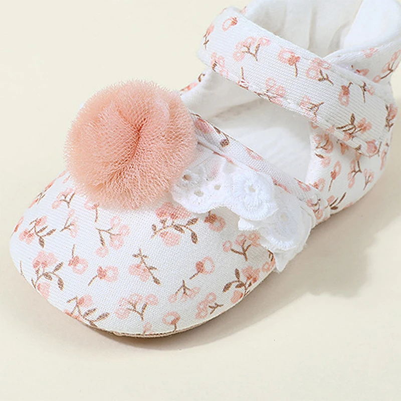 Patrón: estampado floral, bola 3D, ribete de encaje.