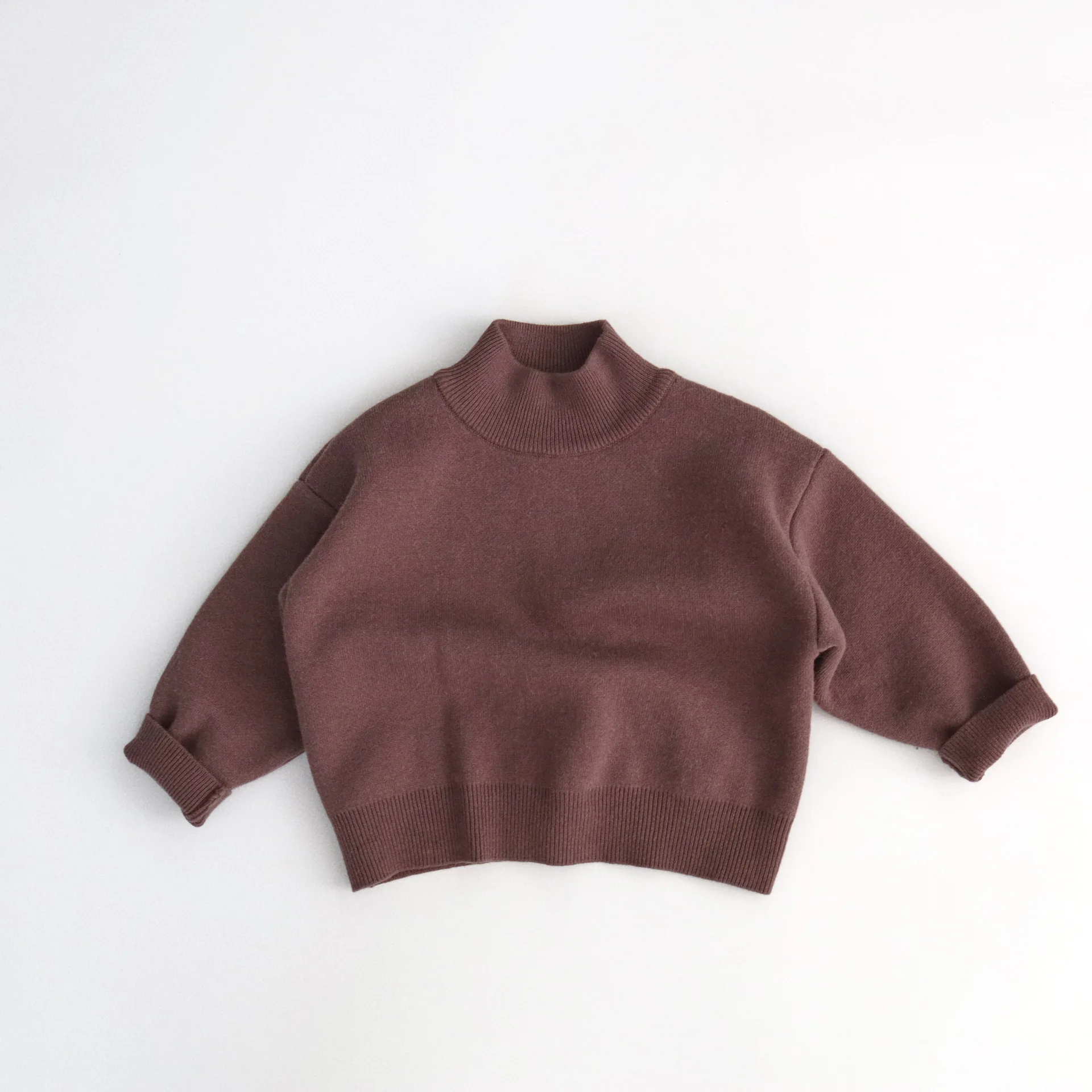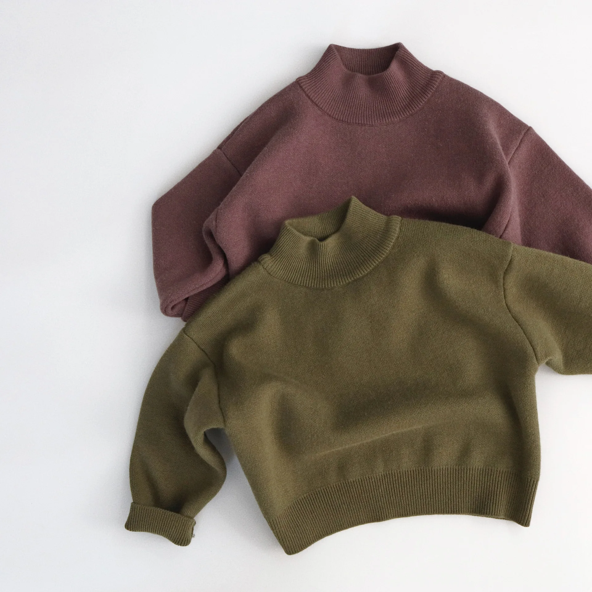 Suéter básico de invierno de cuello alto para niños, Jersey de punto coreano de Color sólido, forro de piel, prendas de punto para niños, suéter básico para niños