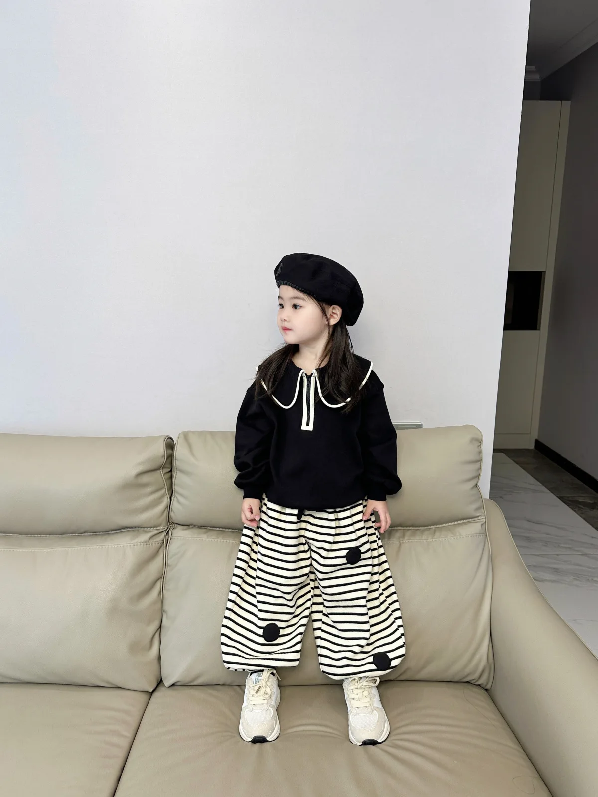 Comprar Suéter de cuello azul marino para niña, Top holgado de moda para bebé de tamaño pequeño y mediano, edición coreana, otoño, 2024